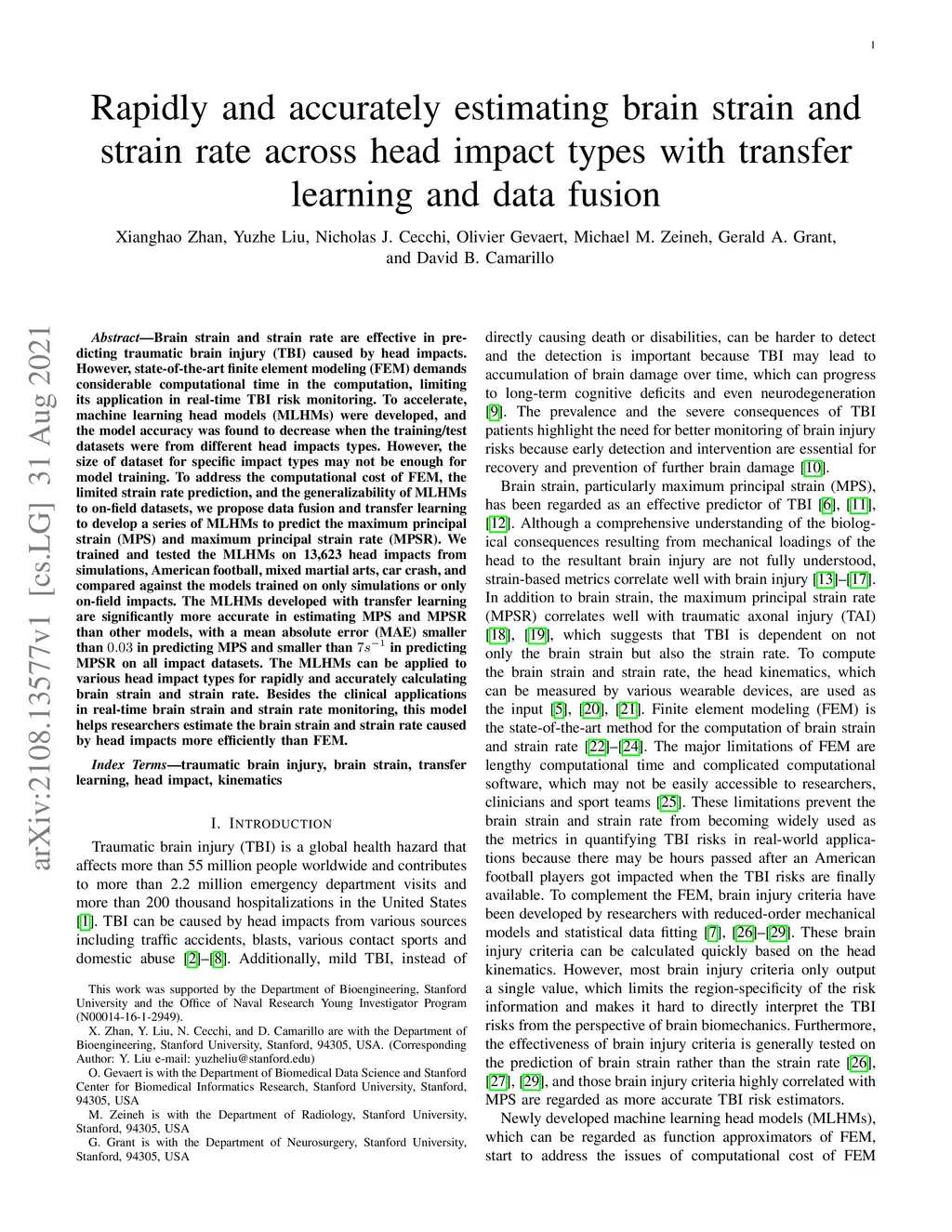 Brain strain and strain rate are effective in predicting traumatic brain injury (TBI) caused by head impacts. However, state-of-the-art finite element modeling (FEM) demands considerable computational time in the computation, limiting its application in real-time TBI risk monitoring. To accelerate, machine learning head models (MLHMs) were developed, and the model accuracy was found to decrease when the training/test datasets were from different head impacts types. However, the size of dataset for specific impact types may not be enough for model training. To address the computational cost of FEM, the limited strain rate prediction, and the generalizability of MLHMs to on-field datasets, we propose data fusion and transfer learning to develop a series of MLHMs to predict the maximum principal strain (MPS) and maximum principal strain rate (MPSR). We trained and tested the MLHMs on 13,623 head impacts from simulations, American football, mixed martial arts, car crash, and compared against the models trained on only simulations or only on-field impacts. The MLHMs developed with transfer learning are significantly more accurate in estimating MPS and MPSR than other models, with a mean absolute error (MAE) smaller than 0.03 in predicting MPS and smaller than 7 (1/s) in predicting MPSR on all impact datasets. The MLHMs can be applied to various head impact types for rapidly and accurately calculating brain strain and strain rate. Besides the clinical applications in real-time brain strain and strain rate monitoring, this model helps researchers estimate the brain strain and strain rate caused by head impacts more efficiently than FEM.