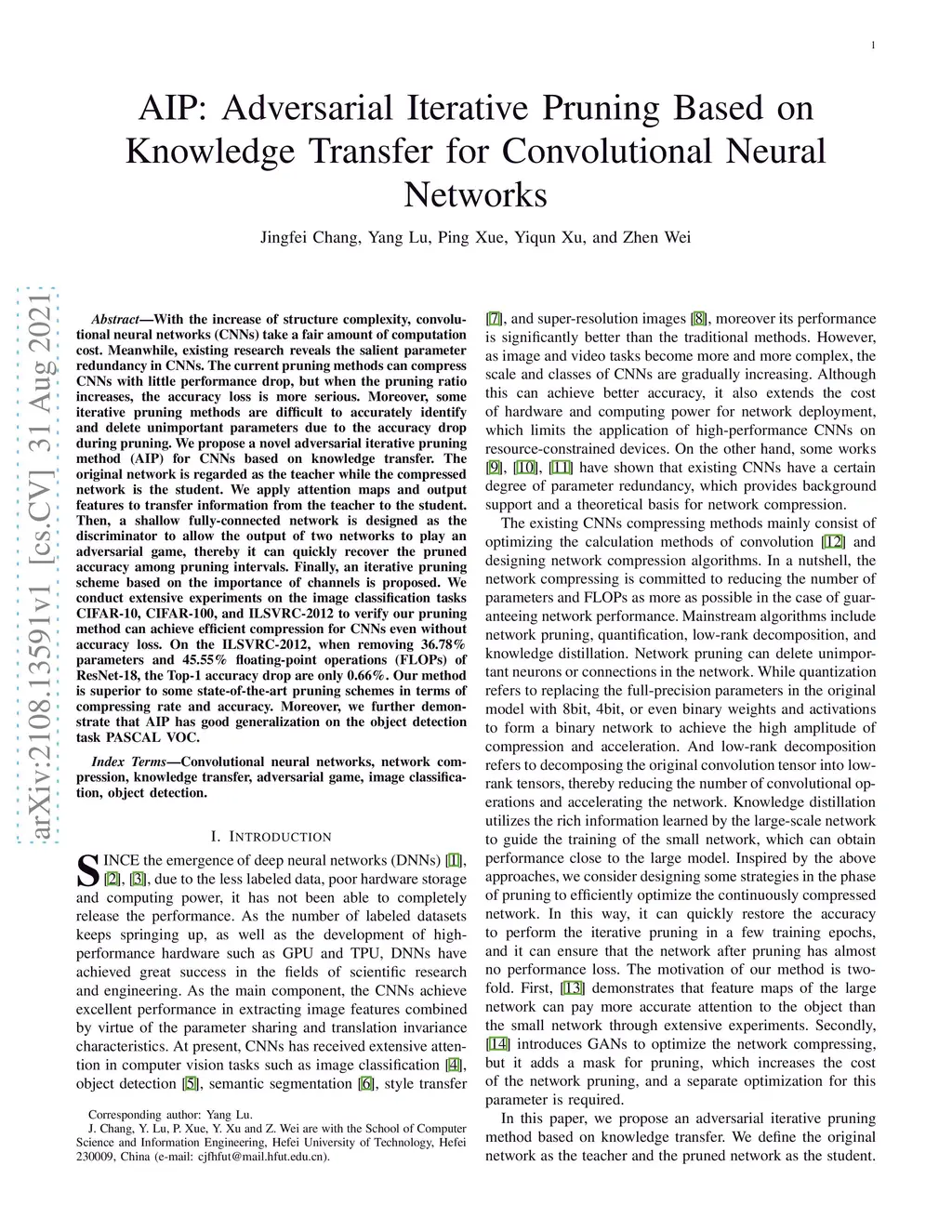 With the increase of structure complexity, convolutional neural networks (CNNs) take a fair amount of computation cost. Meanwhile, existing research reveals the salient parameter redundancy in CNNs. The current pruning methods can compress CNNs with little performance drop, but when the pruning ratio increases, the accuracy loss is more serious. Moreover, some iterative pruning methods are difficult to accurately identify and delete unimportant parameters due to the accuracy drop during pruning. We propose a novel adversarial iterative pruning method (AIP) for CNNs based on knowledge transfer. The original network is regarded as the teacher while the compressed network is the student. We apply attention maps and output features to transfer information from the teacher to the student. Then, a shallow fully-connected network is designed as the discriminator to allow the output of two networks to play an adversarial game, thereby it can quickly recover the pruned accuracy among pruning intervals. Finally, an iterative pruning scheme based on the importance of channels is proposed. We conduct extensive experiments on the image classification tasks CIFAR-10, CIFAR-100, and ILSVRC-2012 to verify our pruning method can achieve efficient compression for CNNs even without accuracy loss. On the ILSVRC-2012, when removing 36.78% parameters and 45.55% floating-point operations (FLOPs) of ResNet-18, the Top-1 accuracy drop are only 0.66%. Our method is superior to some state-of-the-art pruning schemes in terms of compressing rate and accuracy. Moreover, we further demonstrate that AIP has good generalization on the object detection task PASCAL VOC.