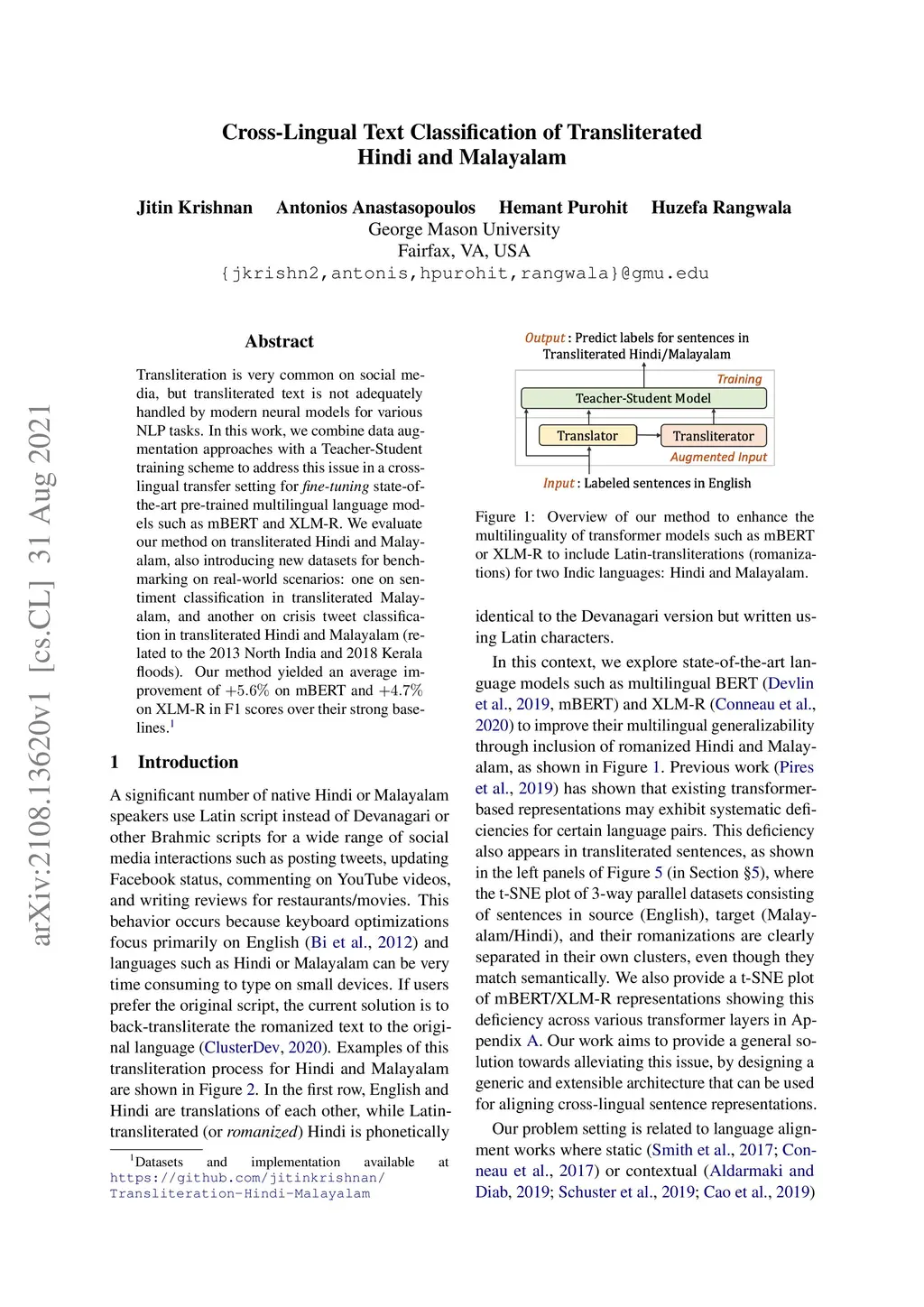 Transliteration is very common on social media, but transliterated text is not adequately handled by modern neural models for various NLP tasks. In this work, we combine data augmentation approaches with a Teacher-Student training scheme to address this issue in a cross-lingual transfer setting for fine-tuning state-of-the-art pre-trained multilingual language models such as mBERT and XLM-R. We evaluate our method on transliterated Hindi and Malayalam, also introducing new datasets for benchmarking on real-world scenarios: one on sentiment classification in transliterated Malayalam, and another on crisis tweet classification in transliterated Hindi and Malayalam (related to the 2013 North India and 2018 Kerala floods). Our method yielded an average improvement of +5.6% on mBERT and +4.7% on XLM-R in F1 scores over their strong baselines.