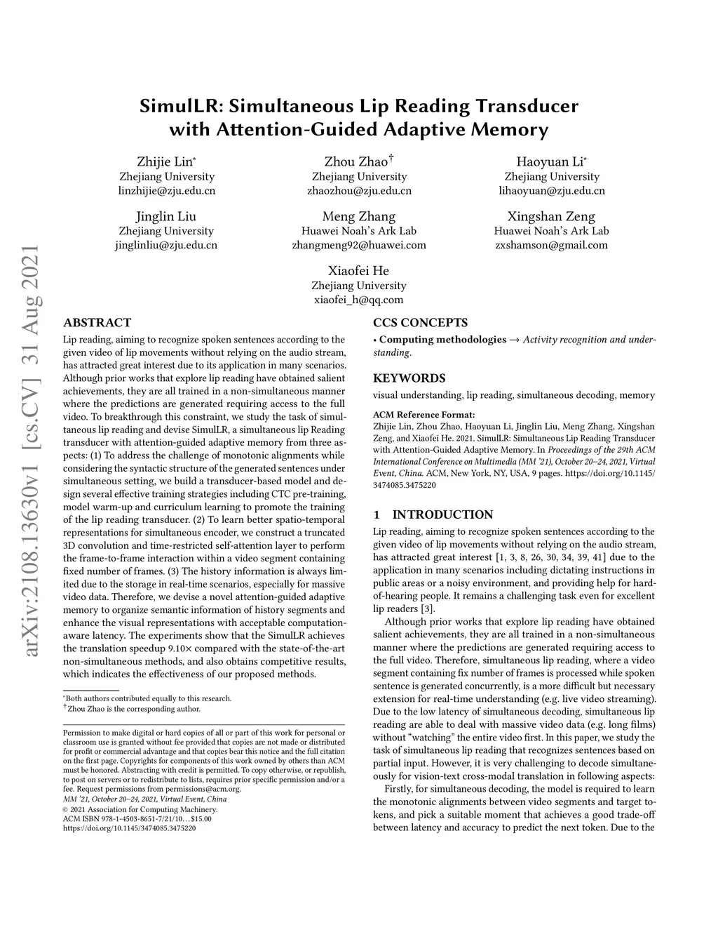 Lip reading, aiming to recognize spoken sentences according to the given video of lip movements without relying on the audio stream, has attracted great interest due to its application in many scenarios. Although prior works that explore lip reading have obtained salient achievements, they are all trained in a non-simultaneous manner where the predictions are generated requiring access to the full video. To breakthrough this constraint, we study the task of simultaneous lip reading and devise SimulLR, a simultaneous lip Reading transducer with attention-guided adaptive memory from three aspects: (1) To address the challenge of monotonic alignments while considering the syntactic structure of the generated sentences under simultaneous setting, we build a transducer-based model and design several effective training strategies including CTC pre-training, model warm-up and curriculum learning to promote the training of the lip reading transducer. (2) To learn better spatio-temporal representations for simultaneous encoder, we construct a truncated 3D convolution and time-restricted self-attention layer to perform the frame-to-frame interaction within a video segment containing fixed number of frames. (3) The history information is always limited due to the storage in real-time scenarios, especially for massive video data. Therefore, we devise a novel attention-guided adaptive memory to organize semantic information of history segments and enhance the visual representations with acceptable computation-aware latency. The experiments show that the SimulLR achieves the translation speedup 9.10 compared with the state-of-the-art non-simultaneous methods, and also obtains competitive results, which indicates the effectiveness of our proposed methods.