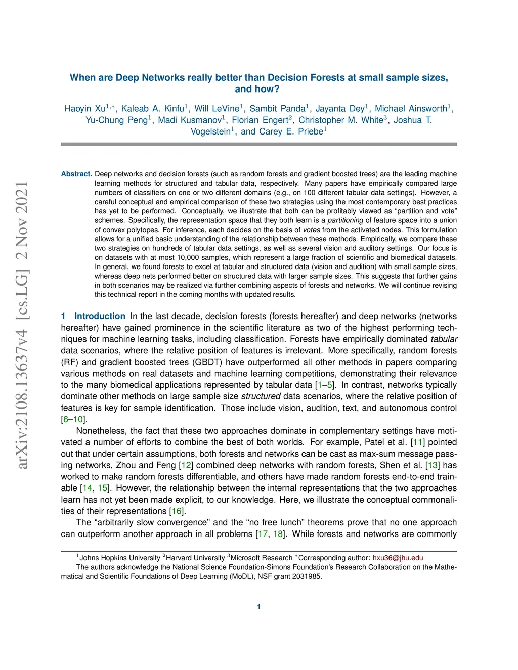 Deep networks and decision forests (such as random forests and gradient boosted trees) are the leading machine learning methods for structured and tabular data, respectively. Many papers have empirically compared large numbers of classifiers on one or two different domains (e.g., on 100 different tabular data settings). However, a careful conceptual and empirical comparison of these two strategies using the most contemporary best practices has yet to be performed. Conceptually, we illustrate that both can be profitably viewed as "partition and vote" schemes. Specifically, the representation space that they both learn is a partitioning of feature space into a union of convex polytopes. For inference, each decides on the basis of votes from the activated nodes. This formulation allows for a unified basic understanding of the relationship between these methods. Empirically, we compare these two strategies on hundreds of tabular data settings, as well as several vision and auditory settings. Our focus is on datasets with at most 10,000 samples, which represent a large fraction of scientific and biomedical datasets. In general, we found forests to excel at tabular and structured data (vision and audition) with small sample sizes, whereas deep nets performed better on structured data with larger sample sizes. This suggests that further gains in both scenarios may be realized via further combining aspects of forests and networks. We will continue revising this technical report in the coming months with updated results.