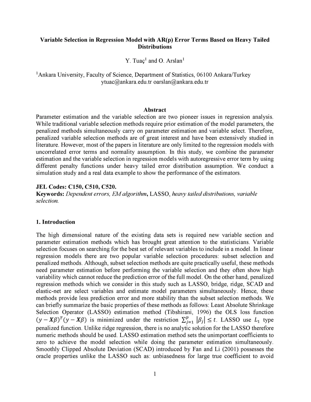 Parameter estimation and the variable selection are two pioneer issues in regression analysis. While traditional variable selection methods require prior estimation of the model parameters, the penalized methods simultaneously carry on parameter estimation and variable select. Therefore, penalized variable selection methods are of great interest and have been extensively studied in literature. However, most of the papers in literature are only limited to the regression models with uncorrelated error terms and normality assumption. In this study, we combine the parameter estimation and the variable selection in regression models with autoregressive error term by using different penalty functions under heavy tailed error distribution assumption. We conduct a simulation study and a real data example to show the performance of the estimators.