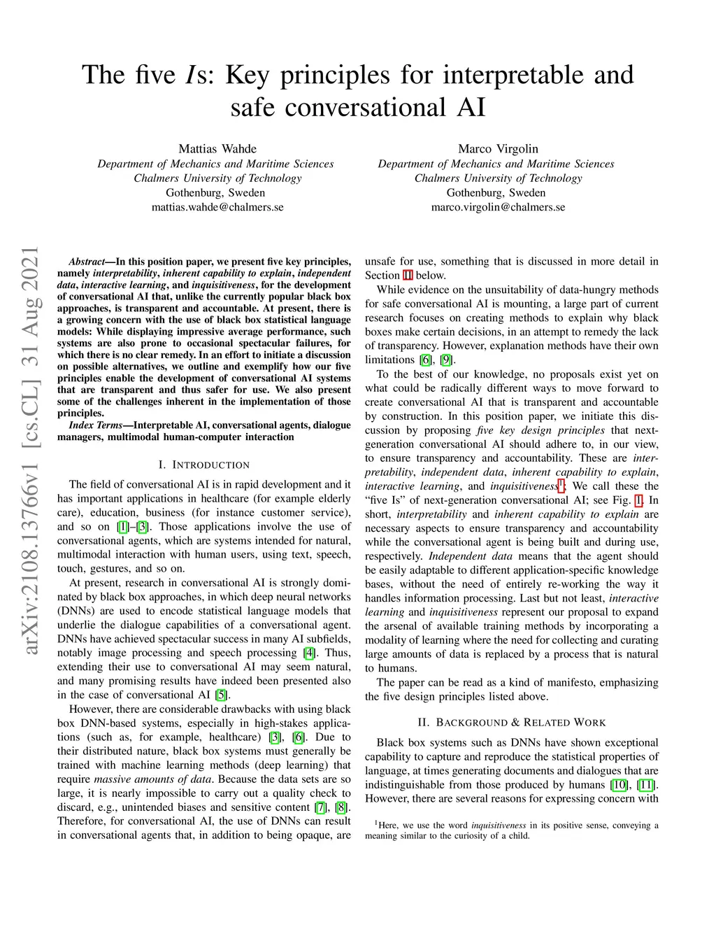 In this position paper, we present five key principles, namely interpretability, inherent capability to explain, independent data, interactive learning, and inquisitiveness, for the development of conversational AI that, unlike the currently popular black box approaches, is transparent and accountable. At present, there is a growing concern with the use of black box statistical language models: While displaying impressive average performance, such systems are also prone to occasional spectacular failures, for which there is no clear remedy. In an effort to initiate a discussion on possible alternatives, we outline and exemplify how our five principles enable the development of conversational AI systems that are transparent and thus safer for use. We also present some of the challenges inherent in the implementation of those principles.