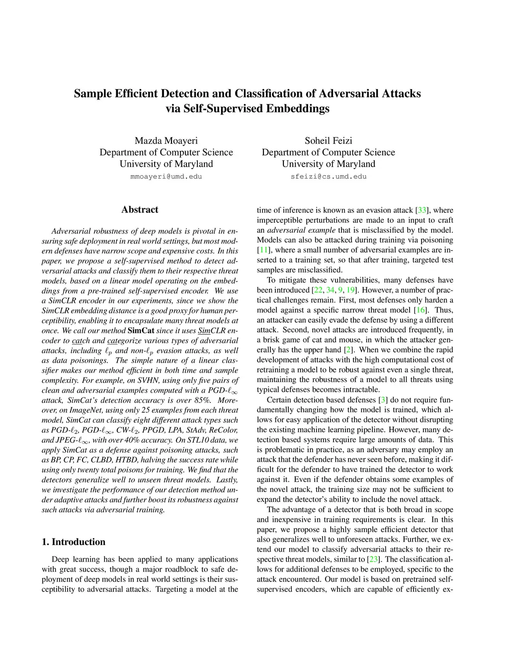 Adversarial robustness of deep models is pivotal in ensuring safe deployment in real world settings, but most modern defenses have narrow scope and expensive costs. In this paper, we propose a self-supervised method to detect adversarial attacks and classify them to their respective threat models, based on a linear model operating on the embeddings from a pre-trained self-supervised encoder. We use a SimCLR encoder in our experiments, since we show the SimCLR embedding distance is a good proxy for human perceptibility, enabling it to encapsulate many threat models at once. We call our method SimCat since it uses SimCLR encoder to catch and categorize various types of adversarial attacks, including L_p and non-L_p evasion attacks, as well as data poisonings. The simple nature of a linear classifier makes our method efficient in both time and sample complexity. For example, on SVHN, using only five pairs of clean and adversarial examples computed with a PGD-L_inf attack, SimCat's detection accuracy is over 85%. Moreover, on ImageNet, using only 25 examples from each threat model, SimCat can classify eight different attack types such as PGD-L_2, PGD-L_inf, CW-L_2, PPGD, LPA, StAdv, ReColor, and JPEG-L_inf, with over 40% accuracy. On STL10 data, we apply SimCat as a defense against poisoning attacks, such as BP, CP, FC, CLBD, HTBD, halving the success rate while using only twenty total poisons for training. We find that the detectors generalize well to unseen threat models. Lastly, we investigate the performance of our detection method under adaptive attacks and further boost its robustness against such attacks via adversarial training.