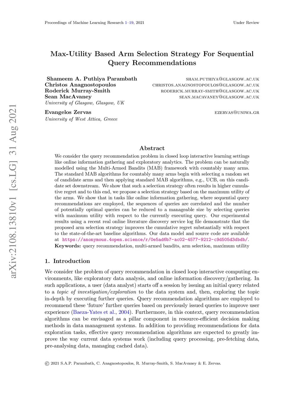 We consider the query recommendation problem in closed loop interactive learning settings like online information gathering and exploratory analytics. The problem can be naturally modelled using the Multi-Armed Bandits (MAB) framework with countably many arms. The standard MAB algorithms for countably many arms begin with selecting a random set of candidate arms and then applying standard MAB algorithms, e.g., UCB, on this candidate set downstream. We show that such a selection strategy often results in higher cumulative regret and to this end, we propose a selection strategy based on the maximum utility of the arms. We show that in tasks like online information gathering, where sequential query recommendations are employed, the sequences of queries are correlated and the number of potentially optimal queries can be reduced to a manageable size by selecting queries with maximum utility with respect to the currently executing query. Our experimental results using a recent real online literature discovery service log file demonstrate that the proposed arm selection strategy improves the cumulative regret substantially with respect to the state-of-the-art baseline algorithms. % and commonly used random selection strategy for a variety of contextual multi-armed bandit algorithms. Our data model and source code are available at ~\url{https://anonymous.4open.science/r/0e5ad6b7-ac02-4577-9212-c9d505d3dbdb/}.