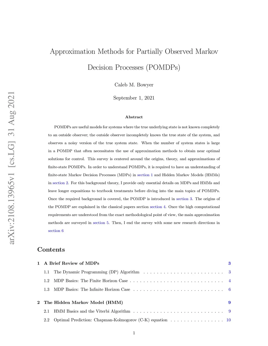 POMDPs are useful models for systems where the true underlying state is not known completely to an outside observer; the outside observer incompletely knows the true state of the system, and observes a noisy version of the true system state. When the number of system states is large in a POMDP that often necessitates the use of approximation methods to obtain near optimal solutions for control. This survey is centered around the origins, theory, and approximations of finite-state POMDPs. In order to understand POMDPs, it is required to have an understanding of finite-state Markov Decision Processes (MDPs) in \autoref{mdp} and Hidden Markov Models (HMMs) in \autoref{hmm}. For this background theory, I provide only essential details on MDPs and HMMs and leave longer expositions to textbook treatments before diving into the main topics of POMDPs. Once the required background is covered, the POMDP is introduced in \autoref{pomdp}. The origins of the POMDP are explained in the classical papers section \autoref{classical}. Once the high computational requirements are understood from the exact methodological point of view, the main approximation methods are surveyed in \autoref{approximations}. Then, I end the survey with some new research directions in \autoref{conclusion}.