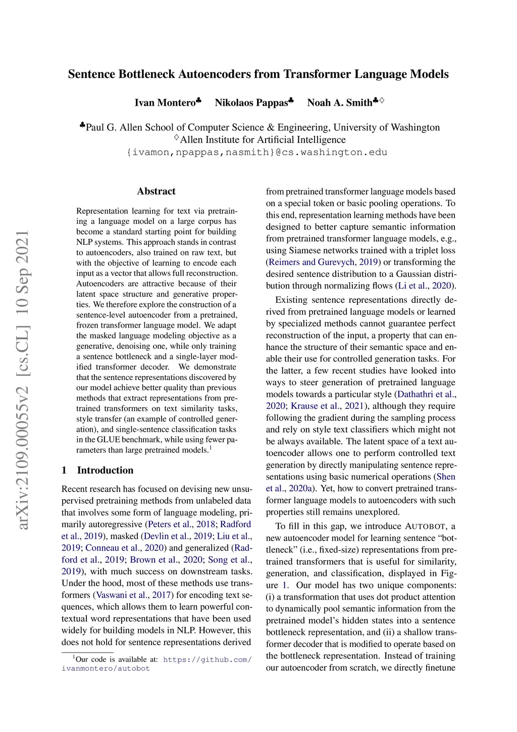 Representation learning for text via pretraining a language model on a large corpus has become a standard starting point for building NLP systems. This approach stands in contrast to autoencoders, also trained on raw text, but with the objective of learning to encode each input as a vector that allows full reconstruction. Autoencoders are attractive because of their latent space structure and generative properties. We therefore explore the construction of a sentence-level autoencoder from a pretrained, frozen transformer language model. We adapt the masked language modeling objective as a generative, denoising one, while only training a sentence bottleneck and a single-layer modified transformer decoder. We demonstrate that the sentence representations discovered by our model achieve better quality than previous methods that extract representations from pretrained transformers on text similarity tasks, style transfer (an example of controlled generation), and single-sentence classification tasks in the GLUE benchmark, while using fewer parameters than large pretrained models.
