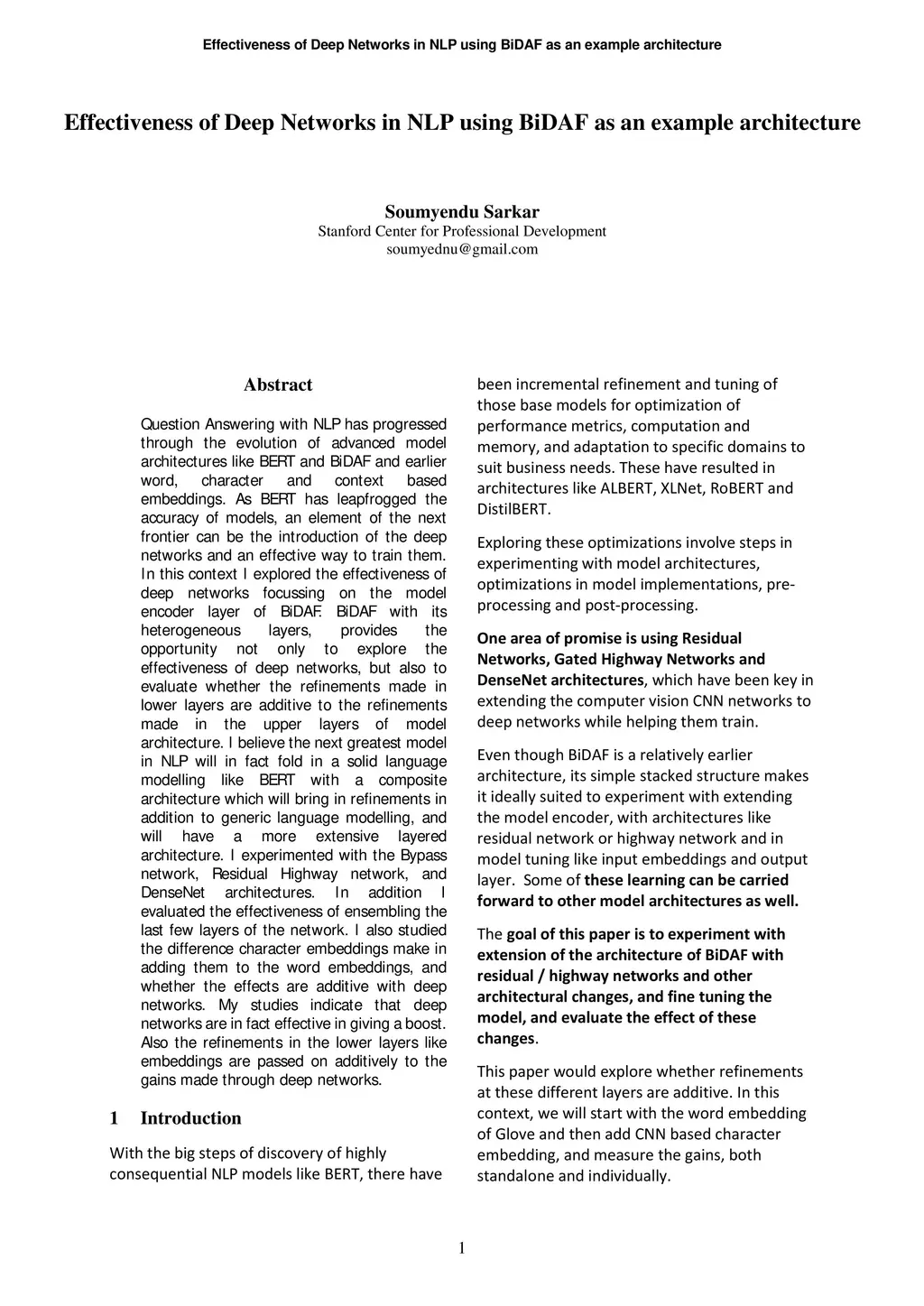 Question Answering with NLP has progressed through the evolution of advanced model architectures like BERT and BiDAF and earlier word, character, and context-based embeddings. As BERT has leapfrogged the accuracy of models, an element of the next frontier can be the introduction of deep networks and an effective way to train them. In this context, I explored the effectiveness of deep networks focussing on the model encoder layer of BiDAF. BiDAF with its heterogeneous layers provides the opportunity not only to explore the effectiveness of deep networks but also to evaluate whether the refinements made in lower layers are additive to the refinements made in the upper layers of the model architecture. I believe the next greatest model in NLP will in fact fold in a solid language modeling like BERT with a composite architecture which will bring in refinements in addition to generic language modeling and will have a more extensive layered architecture. I experimented with the Bypass network, Residual Highway network, and DenseNet architectures. In addition, I evaluated the effectiveness of ensembling the last few layers of the network. I also studied the difference character embeddings make in adding them to the word embeddings, and whether the effects are additive with deep networks. My studies indicate that deep networks are in fact effective in giving a boost. Also, the refinements in the lower layers like embeddings are passed on additively to the gains made through deep networks.