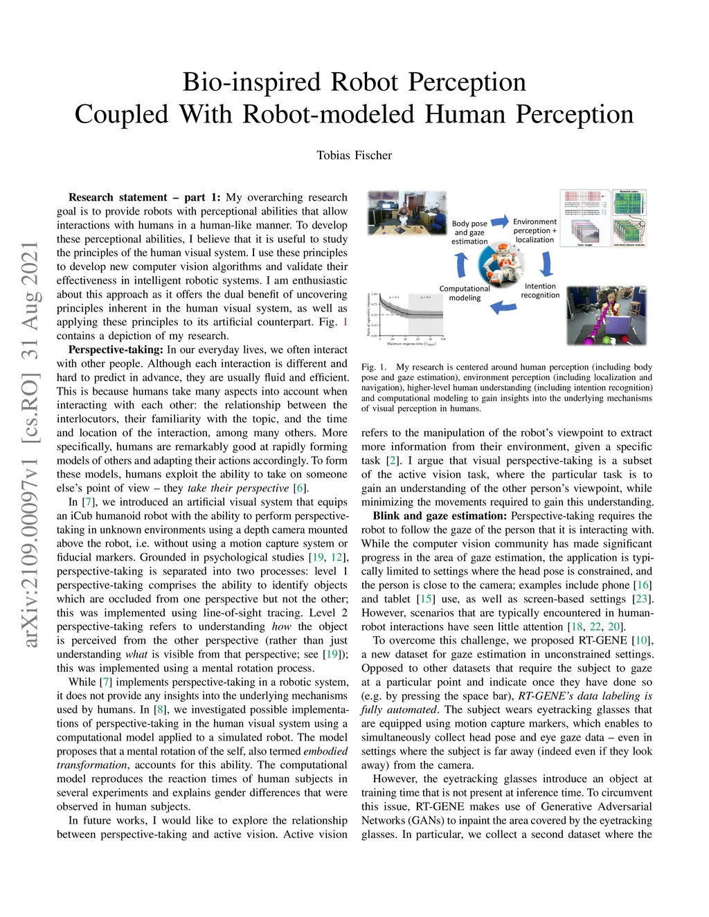 My overarching research goal is to provide robots with perceptional abilities that allow interactions with humans in a human-like manner. To develop these perceptional abilities, I believe that it is useful to study the principles of the human visual system. I use these principles to develop new computer vision algorithms and validate their effectiveness in intelligent robotic systems. I am enthusiastic about this approach as it offers the dual benefit of uncovering principles inherent in the human visual system, as well as applying these principles to its artificial counterpart. Fig. 1 contains a depiction of my research.