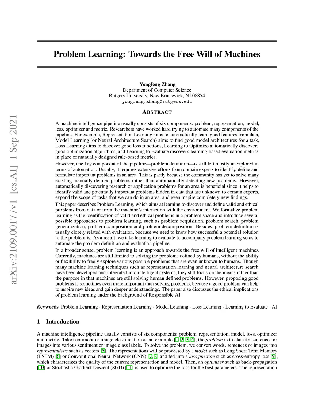 A machine intelligence pipeline usually consists of six components: problem, representation, model, loss, optimizer and metric. Researchers have worked hard trying to automate many components of the pipeline. However, one key component of the pipeline--problem definition--is still left mostly unexplored in terms of automation. Usually, it requires extensive efforts from domain experts to identify, define and formulate important problems in an area. However, automatically discovering research or application problems for an area is beneficial since it helps to identify valid and potentially important problems hidden in data that are unknown to domain experts, expand the scope of tasks that we can do in an area, and even inspire completely new findings. This paper describes Problem Learning, which aims at learning to discover and define valid and ethical problems from data or from the machine's interaction with the environment. We formalize problem learning as the identification of valid and ethical problems in a problem space and introduce several possible approaches to problem learning. In a broader sense, problem learning is an approach towards the free will of intelligent machines. Currently, machines are still limited to solving the problems defined by humans, without the ability or flexibility to freely explore various possible problems that are even unknown to humans. Though many machine learning techniques have been developed and integrated into intelligent systems, they still focus on the means rather than the purpose in that machines are still solving human defined problems. However, proposing good problems is sometimes even more important than solving problems, because a good problem can help to inspire new ideas and gain deeper understandings. The paper also discusses the ethical implications of problem learning under the background of Responsible AI.
