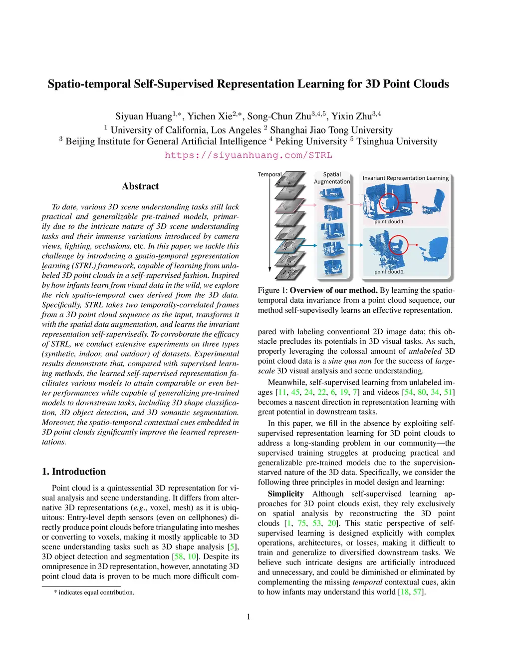 To date, various 3D scene understanding tasks still lack practical and generalizable pre-trained models, primarily due to the intricate nature of 3D scene understanding tasks and their immense variations introduced by camera views, lighting, occlusions, etc. In this paper, we tackle this challenge by introducing a spatio-temporal representation learning (STRL) framework, capable of learning from unlabeled 3D point clouds in a self-supervised fashion. Inspired by how infants learn from visual data in the wild, we explore the rich spatio-temporal cues derived from the 3D data. Specifically, STRL takes two temporally-correlated frames from a 3D point cloud sequence as the input, transforms it with the spatial data augmentation, and learns the invariant representation self-supervisedly. To corroborate the efficacy of STRL, we conduct extensive experiments on three types (synthetic, indoor, and outdoor) of datasets. Experimental results demonstrate that, compared with supervised learning methods, the learned self-supervised representation facilitates various models to attain comparable or even better performances while capable of generalizing pre-trained models to downstream tasks, including 3D shape classification, 3D object detection, and 3D semantic segmentation. Moreover, the spatio-temporal contextual cues embedded in 3D point clouds significantly improve the learned representations.