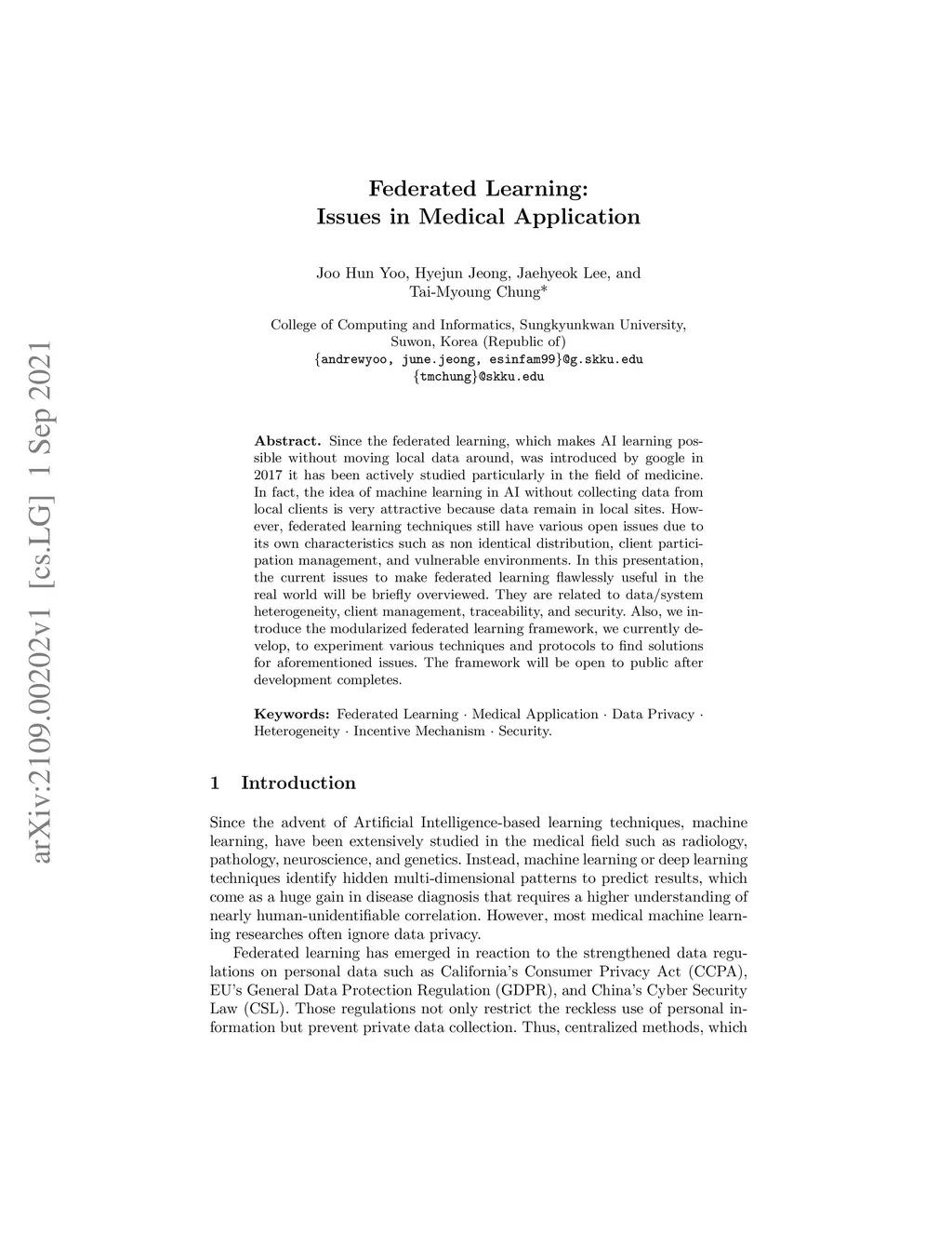 Since the federated learning, which makes AI learning possible without moving local data around, was introduced by google in 2017 it has been actively studied particularly in the field of medicine. In fact, the idea of machine learning in AI without collecting data from local clients is very attractive because data remain in local sites. However, federated learning techniques still have various open issues due to its own characteristics such as non identical distribution, client participation management, and vulnerable environments. In this presentation, the current issues to make federated learning flawlessly useful in the real world will be briefly overviewed. They are related to data/system heterogeneity, client management, traceability, and security. Also, we introduce the modularized federated learning framework, we currently develop, to experiment various techniques and protocols to find solutions for aforementioned issues. The framework will be open to public after development completes.