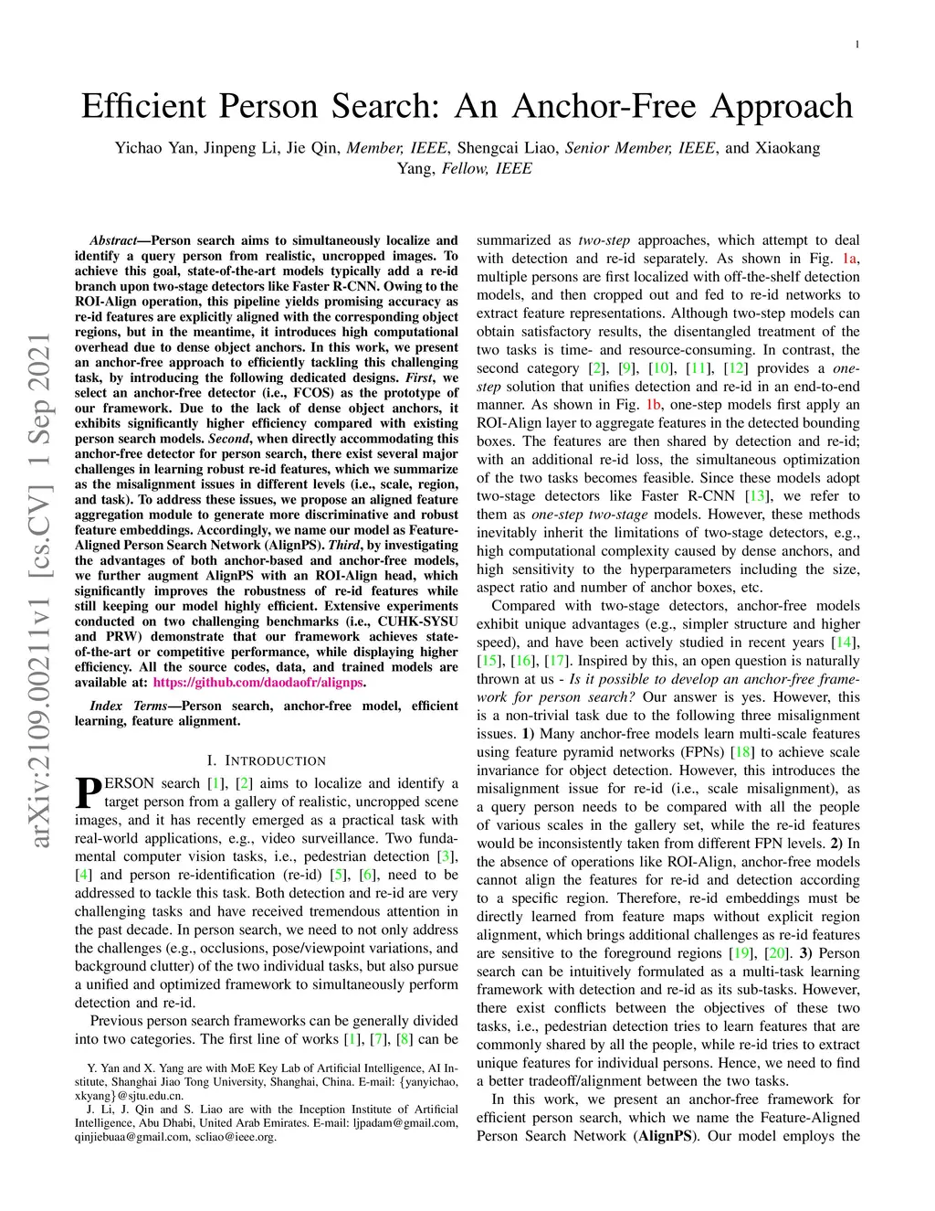 Person search aims to simultaneously localize and identify a query person from realistic, uncropped images. To achieve this goal, state-of-the-art models typically add a re-id branch upon two-stage detectors like Faster R-CNN. Owing to the ROI-Align operation, this pipeline yields promising accuracy as re-id features are explicitly aligned with the corresponding object regions, but in the meantime, it introduces high computational overhead due to dense object anchors. In this work, we present an anchor-free approach to efficiently tackling this challenging task, by introducing the following dedicated designs. First, we select an anchor-free detector (i.e., FCOS) as the prototype of our framework. Due to the lack of dense object anchors, it exhibits significantly higher efficiency compared with existing person search models. Second, when directly accommodating this anchor-free detector for person search, there exist several major challenges in learning robust re-id features, which we summarize as the misalignment issues in different levels (i.e., scale, region, and task). To address these issues, we propose an aligned feature aggregation module to generate more discriminative and robust feature embeddings. Accordingly, we name our model as Feature-Aligned Person Search Network (AlignPS). Third, by investigating the advantages of both anchor-based and anchor-free models, we further augment AlignPS with an ROI-Align head, which significantly improves the robustness of re-id features while still keeping our model highly efficient. Extensive experiments conducted on two challenging benchmarks (i.e., CUHK-SYSU and PRW) demonstrate that our framework achieves state-of-the-art or competitive performance, while displaying higher efficiency. All the source codes, data, and trained models are available at: https://github.com/daodaofr/alignps.