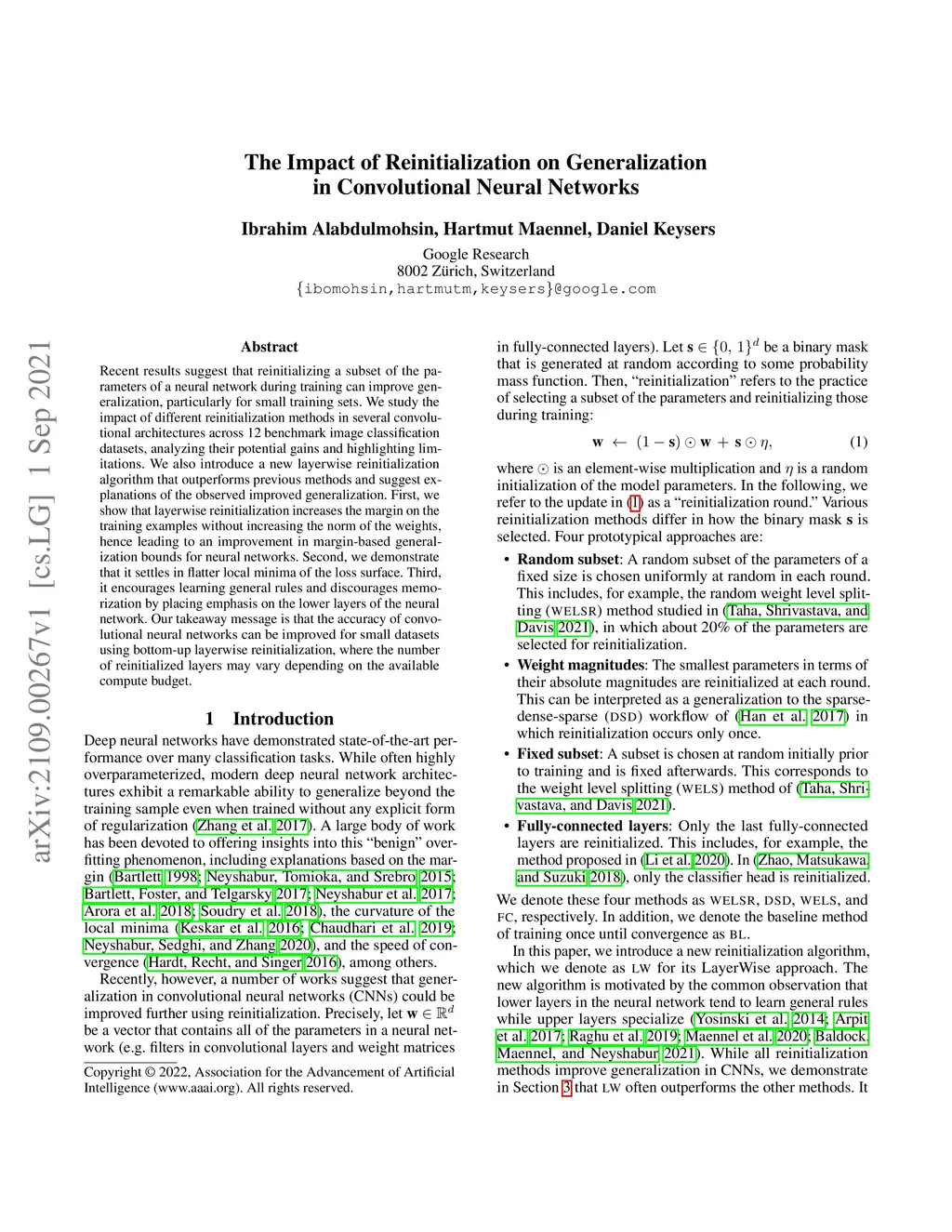 Recent results suggest that reinitializing a subset of the parameters of a neural network during training can improve generalization, particularly for small training sets. We study the impact of different reinitialization methods in several convolutional architectures across 12 benchmark image classification datasets, analyzing their potential gains and highlighting limitations. We also introduce a new layerwise reinitialization algorithm that outperforms previous methods and suggest explanations of the observed improved generalization. First, we show that layerwise reinitialization increases the margin on the training examples without increasing the norm of the weights, hence leading to an improvement in margin-based generalization bounds for neural networks. Second, we demonstrate that it settles in flatter local minima of the loss surface. Third, it encourages learning general rules and discourages memorization by placing emphasis on the lower layers of the neural network. Our takeaway message is that the accuracy of convolutional neural networks can be improved for small datasets using bottom-up layerwise reinitialization, where the number of reinitialized layers may vary depending on the available compute budget.