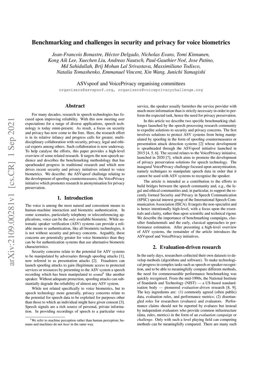 For many decades, research in speech technologies has focused upon improving reliability. With this now meeting user expectations for a range of diverse applications, speech technology is today omni-present. As result, a focus on security and privacy has now come to the fore. Here, the research effort is in its relative infancy and progress calls for greater, multidisciplinary collaboration with security, privacy, legal and ethical experts among others. Such collaboration is now underway. To help catalyse the efforts, this paper provides a high-level overview of some related research. It targets the non-speech audience and describes the benchmarking methodology that has spearheaded progress in traditional research and which now drives recent security and privacy initiatives related to voice biometrics. We describe: the ASVspoof challenge relating to the development of spoofing countermeasures; the VoicePrivacy initiative which promotes research in anonymisation for privacy preservation.
