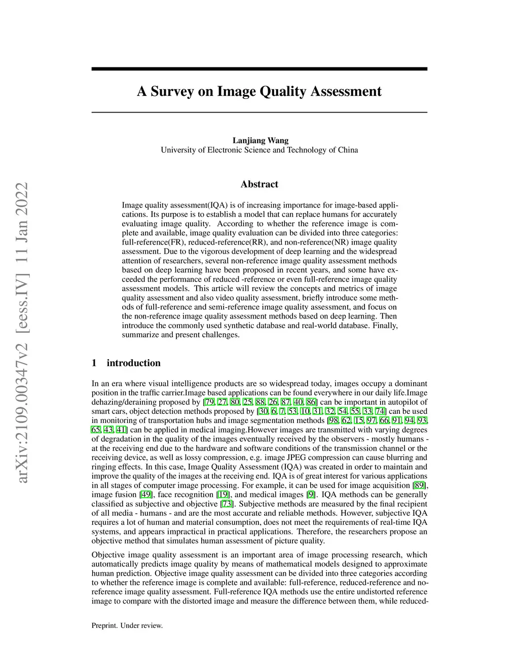 Image quality assessment(IQA) is of increasing importance for image-based applications. Its purpose is to establish a model that can replace humans for accurately evaluating image quality. According to whether the reference image is complete and available, image quality evaluation can be divided into three categories: full-reference(FR), reduced-reference(RR), and non-reference(NR) image quality assessment. Due to the vigorous development of deep learning and the widespread attention of researchers, several non-reference image quality assessment methods based on deep learning have been proposed in recent years, and some have exceeded the performance of reduced -reference or even full-reference image quality assessment models. This article will review the concepts and metrics of image quality assessment and also video quality assessment, briefly introduce some methods of full-reference and semi-reference image quality assessment, and focus on the non-reference image quality assessment methods based on deep learning. Then introduce the commonly used synthetic database and real-world database. Finally, summarize and present challenges.