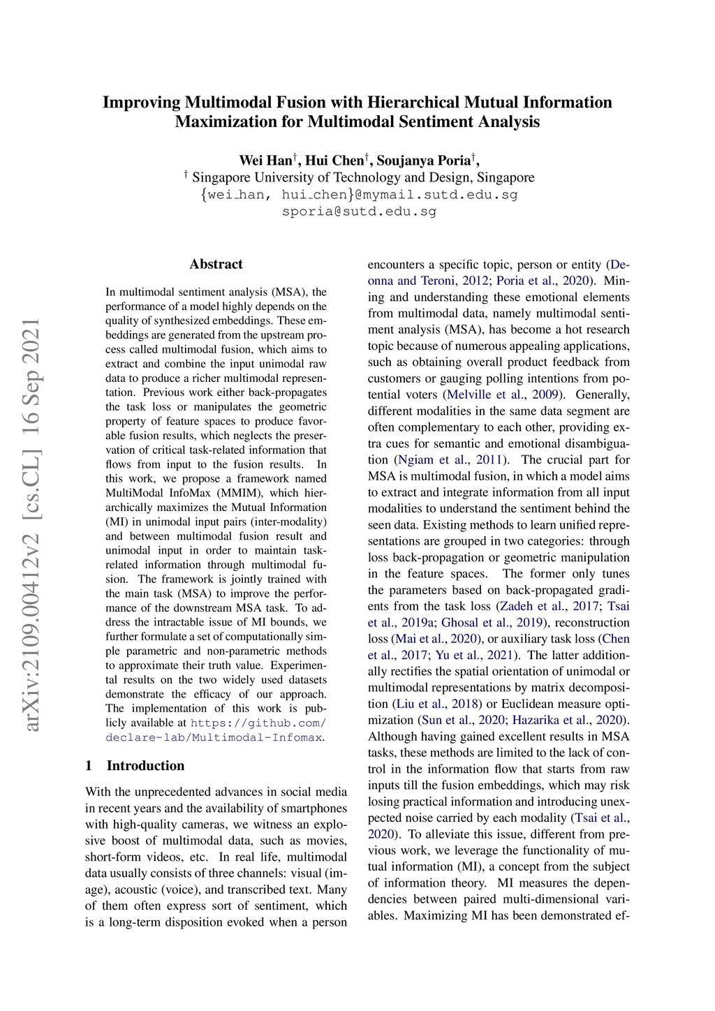 In multimodal sentiment analysis (MSA), the performance of a model highly depends on the quality of synthesized embeddings. These embeddings are generated from the upstream process called multimodal fusion, which aims to extract and combine the input unimodal raw data to produce a richer multimodal representation. Previous work either back-propagates the task loss or manipulates the geometric property of feature spaces to produce favorable fusion results, which neglects the preservation of critical task-related information that flows from input to the fusion results. In this work, we propose a framework named MultiModal InfoMax (MMIM), which hierarchically maximizes the Mutual Information (MI) in unimodal input pairs (inter-modality) and between multimodal fusion result and unimodal input in order to maintain task-related information through multimodal fusion. The framework is jointly trained with the main task (MSA) to improve the performance of the downstream MSA task. To address the intractable issue of MI bounds, we further formulate a set of computationally simple parametric and non-parametric methods to approximate their truth value. Experimental results on the two widely used datasets demonstrate the efficacy of our approach. The implementation of this work is publicly available at https://github.com/declare-lab/Multimodal-Infomax.