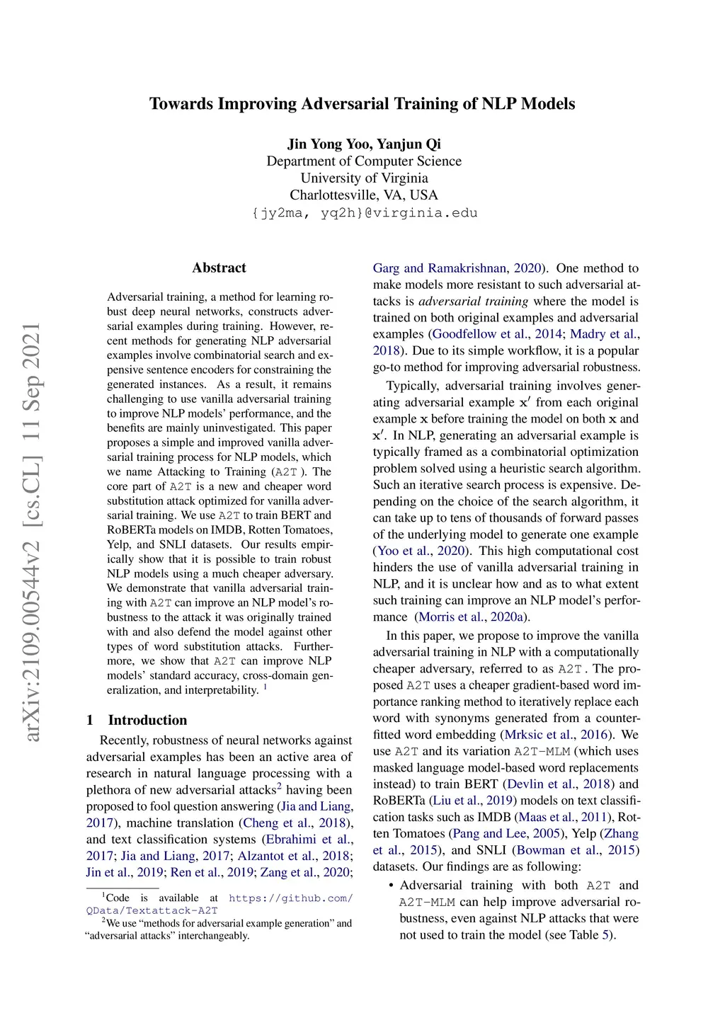 Adversarial training, a method for learning robust deep neural networks, constructs adversarial examples during training. However, recent methods for generating NLP adversarial examples involve combinatorial search and expensive sentence encoders for constraining the generated instances. As a result, it remains challenging to use vanilla adversarial training to improve NLP models' performance, and the benefits are mainly uninvestigated. This paper proposes a simple and improved vanilla adversarial training process for NLP models, which we name Attacking to Training (A2T). The core part of A2T is a new and cheaper word substitution attack optimized for vanilla adversarial training. We use A2T to train BERT and RoBERTa models on IMDB, Rotten Tomatoes, Yelp, and SNLI datasets. Our results empirically show that it is possible to train robust NLP models using a much cheaper adversary. We demonstrate that vanilla adversarial training with A2T can improve an NLP model's robustness to the attack it was originally trained with and also defend the model against other types of word substitution attacks. Furthermore, we show that A2T can improve NLP models' standard accuracy, cross-domain generalization, and interpretability. Code is available at https://github.com/QData/Textattack-A2T .