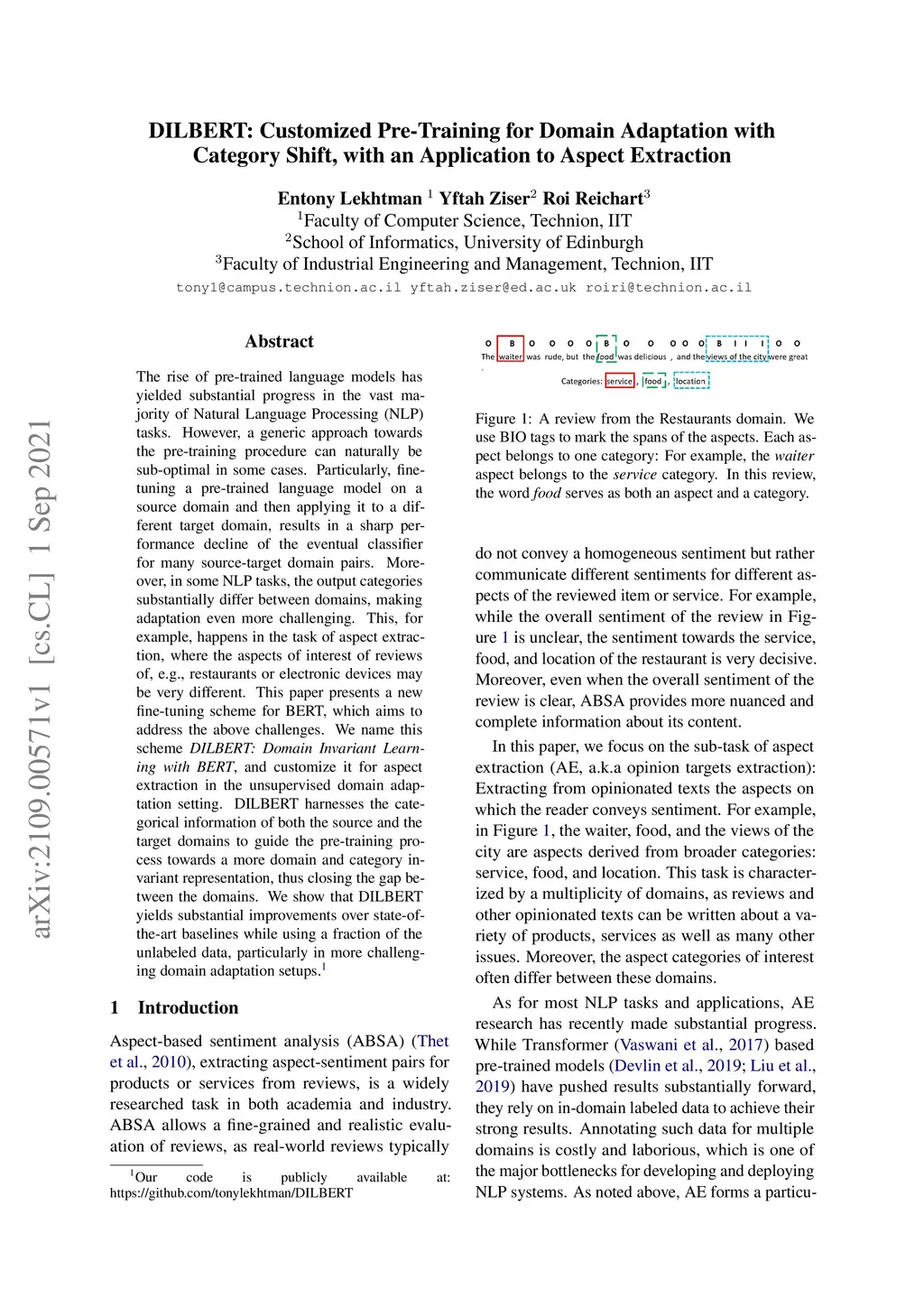 The rise of pre-trained language models has yielded substantial progress in the vast majority of Natural Language Processing (NLP) tasks. However, a generic approach towards the pre-training procedure can naturally be sub-optimal in some cases. Particularly, fine-tuning a pre-trained language model on a source domain and then applying it to a different target domain, results in a sharp performance decline of the eventual classifier for many source-target domain pairs. Moreover, in some NLP tasks, the output categories substantially differ between domains, making adaptation even more challenging. This, for example, happens in the task of aspect extraction, where the aspects of interest of reviews of, e.g., restaurants or electronic devices may be very different. This paper presents a new fine-tuning scheme for BERT, which aims to address the above challenges. We name this scheme DILBERT: Domain Invariant Learning with BERT, and customize it for aspect extraction in the unsupervised domain adaptation setting. DILBERT harnesses the categorical information of both the source and the target domains to guide the pre-training process towards a more domain and category invariant representation, thus closing the gap between the domains. We show that DILBERT yields substantial improvements over state-of-the-art baselines while using a fraction of the unlabeled data, particularly in more challenging domain adaptation setups.