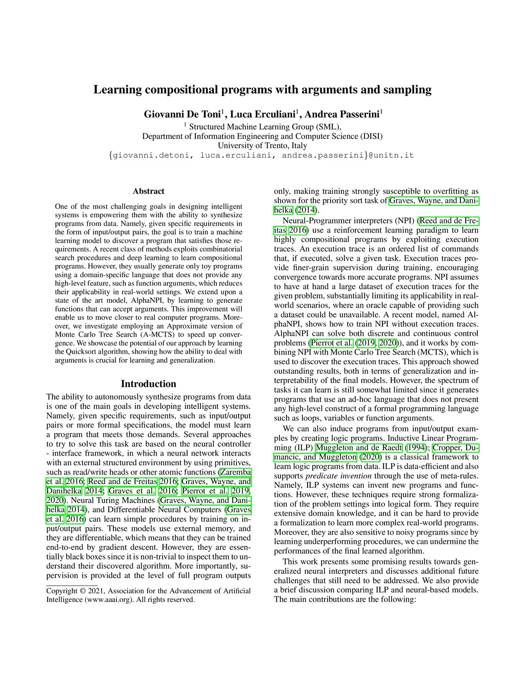 One of the most challenging goals in designing intelligent systems is empowering them with the ability to synthesize programs from data. Namely, given specific requirements in the form of input/output pairs, the goal is to train a machine learning model to discover a program that satisfies those requirements. A recent class of methods exploits combinatorial search procedures and deep learning to learn compositional programs. However, they usually generate only toy programs using a domain-specific language that does not provide any high-level feature, such as function arguments, which reduces their applicability in real-world settings. We extend upon a state of the art model, AlphaNPI, by learning to generate functions that can accept arguments. This improvement will enable us to move closer to real computer programs. Moreover, we investigate employing an Approximate version of Monte Carlo Tree Search (A-MCTS) to speed up convergence. We showcase the potential of our approach by learning the Quicksort algorithm, showing how the ability to deal with arguments is crucial for learning and generalization.