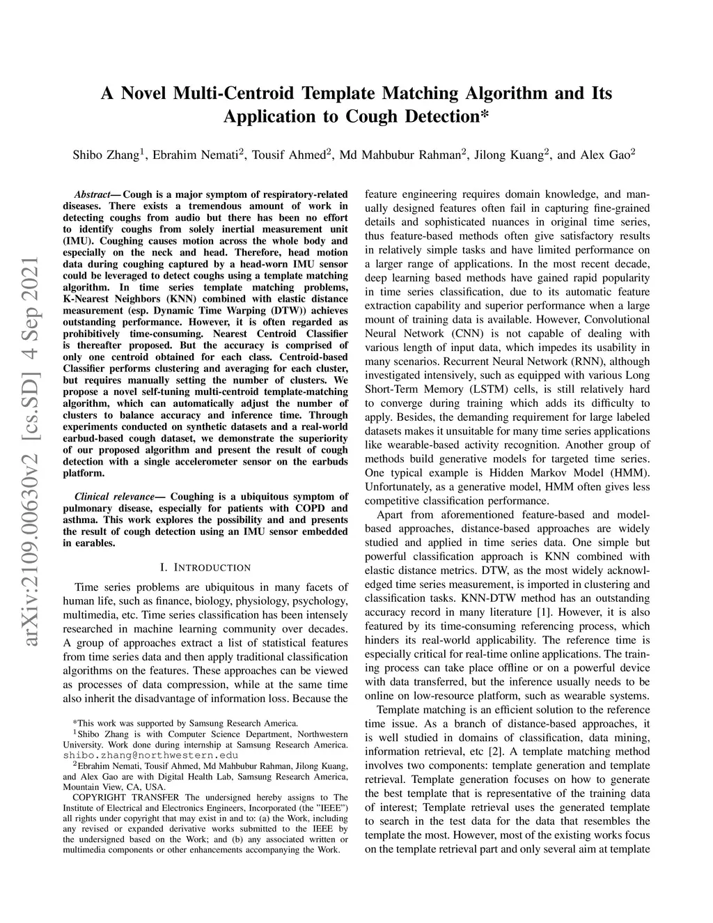 Cough is a major symptom of respiratory-related diseases. There exists a tremendous amount of work in detecting coughs from audio but there has been no effort to identify coughs from solely inertial measurement unit (IMU). Coughing causes motion across the whole body and especially on the neck and head. Therefore, head motion data during coughing captured by a head-worn IMU sensor could be leveraged to detect coughs using a template matching algorithm. In time series template matching problems, K-Nearest Neighbors (KNN) combined with elastic distance measurement (esp. Dynamic Time Warping (DTW)) achieves outstanding performance. However, it is often regarded as prohibitively time-consuming. Nearest Centroid Classifier is thereafter proposed. But the accuracy is comprised of only one centroid obtained for each class. Centroid-based Classifier performs clustering and averaging for each cluster, but requires manually setting the number of clusters. We propose a novel self-tuning multi-centroid template-matching algorithm, which can automatically adjust the number of clusters to balance accuracy and inference time. Through experiments conducted on synthetic datasets and a real-world earbud-based cough dataset, we demonstrate the superiority of our proposed algorithm and present the result of cough detection with a single accelerometer sensor on the earbuds platform.