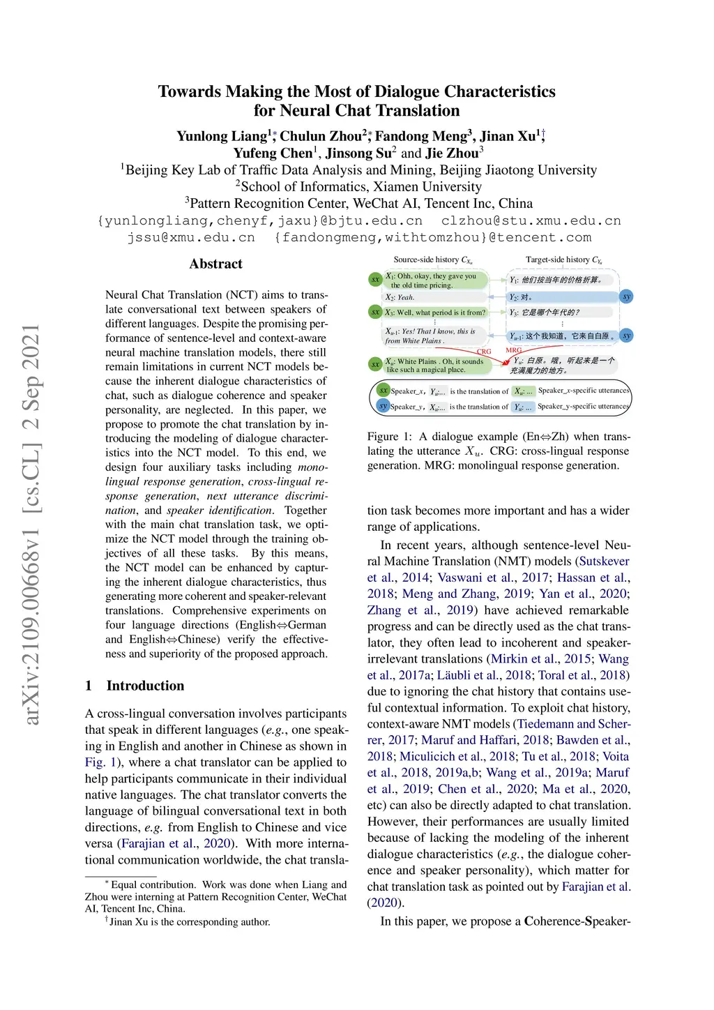 Neural Chat Translation (NCT) aims to translate conversational text between speakers of different languages. Despite the promising performance of sentence-level and context-aware neural machine translation models, there still remain limitations in current NCT models because the inherent dialogue characteristics of chat, such as dialogue coherence and speaker personality, are neglected. In this paper, we propose to promote the chat translation by introducing the modeling of dialogue characteristics into the NCT model. To this end, we design four auxiliary tasks including monolingual response generation, cross-lingual response generation, next utterance discrimination, and speaker identification. Together with the main chat translation task, we optimize the NCT model through the training objectives of all these tasks. By this means, the NCT model can be enhanced by capturing the inherent dialogue characteristics, thus generating more coherent and speaker-relevant translations. Comprehensive experiments on four language directions (English-German and English-Chinese) verify the effectiveness and superiority of the proposed approach.