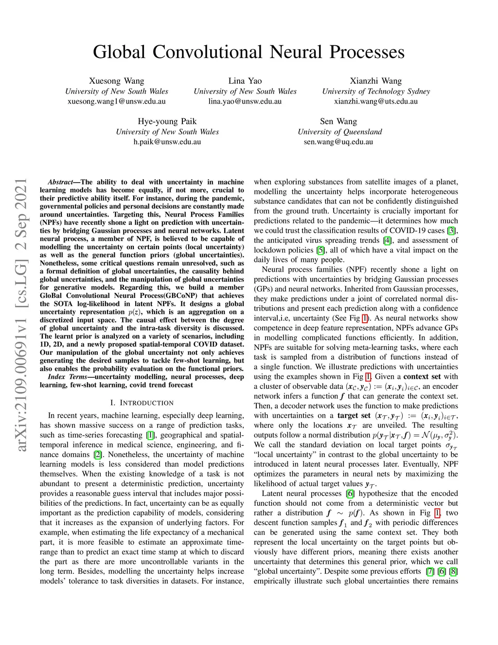 The ability to deal with uncertainty in machine learning models has become equally, if not more, crucial to their predictive ability itself. For instance, during the pandemic, governmental policies and personal decisions are constantly made around uncertainties. Targeting this, Neural Process Families (NPFs) have recently shone a light on prediction with uncertainties by bridging Gaussian processes and neural networks. Latent neural process, a member of NPF, is believed to be capable of modelling the uncertainty on certain points (local uncertainty) as well as the general function priors (global uncertainties). Nonetheless, some critical questions remain unresolved, such as a formal definition of global uncertainties, the causality behind global uncertainties, and the manipulation of global uncertainties for generative models. Regarding this, we build a member GloBal Convolutional Neural Process(GBCoNP) that achieves the SOTA log-likelihood in latent NPFs. It designs a global uncertainty representation p(z), which is an aggregation on a discretized input space. The causal effect between the degree of global uncertainty and the intra-task diversity is discussed. The learnt prior is analyzed on a variety of scenarios, including 1D, 2D, and a newly proposed spatial-temporal COVID dataset. Our manipulation of the global uncertainty not only achieves generating the desired samples to tackle few-shot learning, but also enables the probability evaluation on the functional priors.
