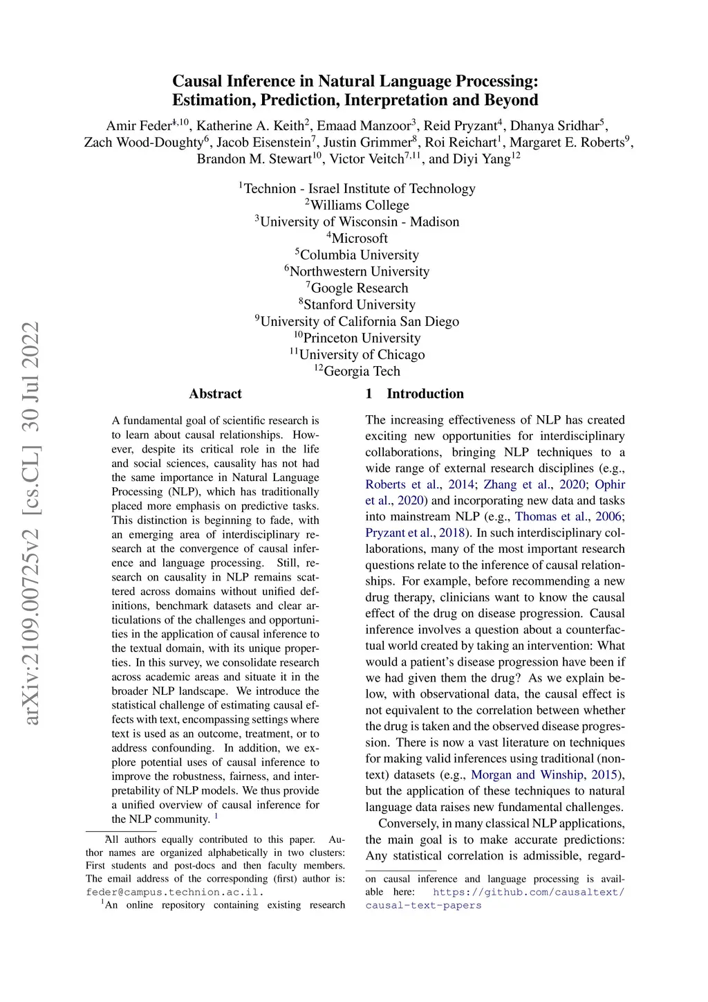 A fundamental goal of scientific research is to learn about causal relationships. However, despite its critical role in the life and social sciences, causality has not had the same importance in Natural Language Processing (NLP), which has traditionally placed more emphasis on predictive tasks. This distinction is beginning to fade, with an emerging area of interdisciplinary research at the convergence of causal inference and language processing. Still, research on causality in NLP remains scattered across domains without unified definitions, benchmark datasets and clear articulations of the challenges and opportunities in the application of causal inference to the textual domain, with its unique properties. In this survey, we consolidate research across academic areas and situate it in the broader NLP landscape. We introduce the statistical challenge of estimating causal effects with text, encompassing settings where text is used as an outcome, treatment, or to address confounding. In addition, we explore potential uses of causal inference to improve the robustness, fairness, and interpretability of NLP models. We thus provide a unified overview of causal inference for the NLP community.
