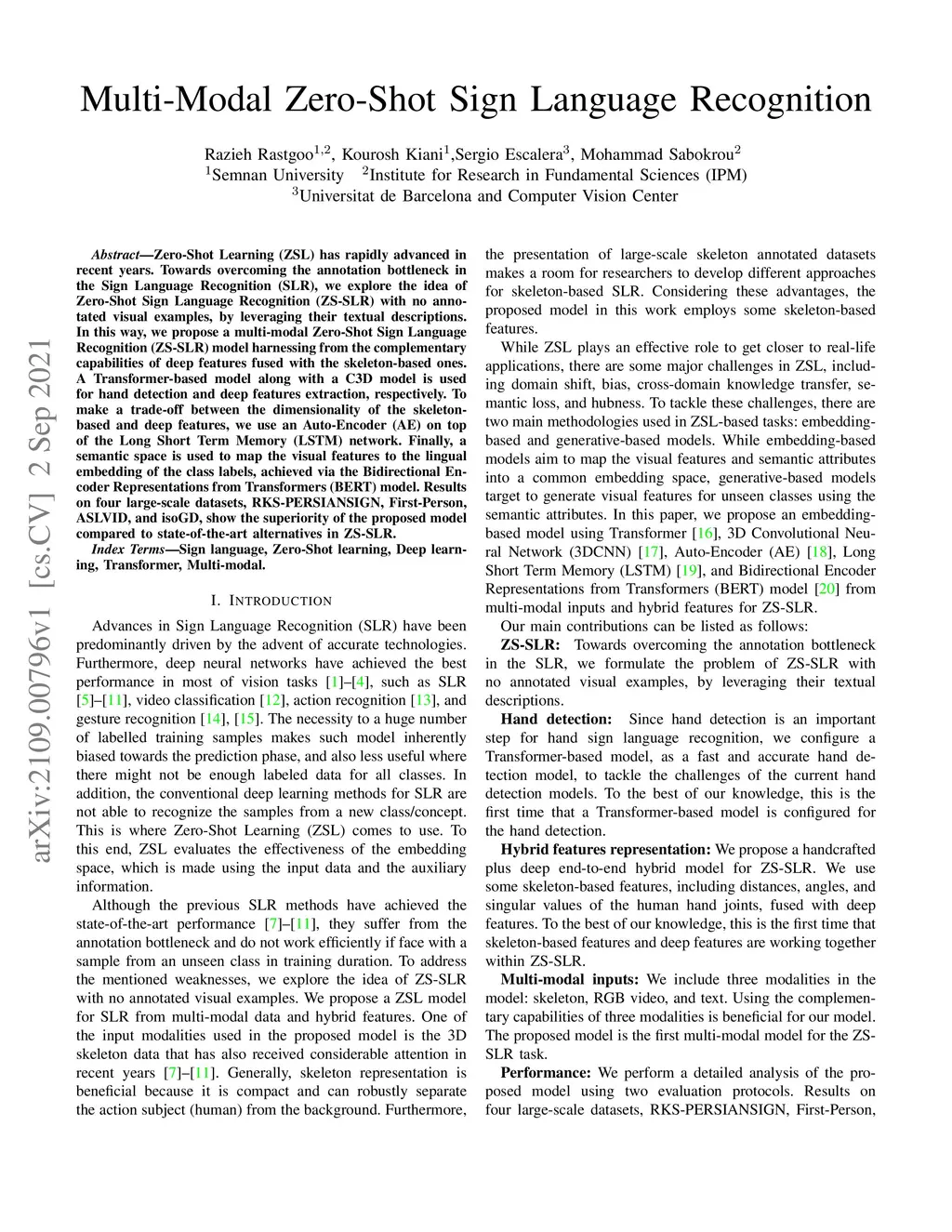 Zero-Shot Learning (ZSL) has rapidly advanced in recent years. Towards overcoming the annotation bottleneck in the Sign Language Recognition (SLR), we explore the idea of Zero-Shot Sign Language Recognition (ZS-SLR) with no annotated visual examples, by leveraging their textual descriptions. In this way, we propose a multi-modal Zero-Shot Sign Language Recognition (ZS-SLR) model harnessing from the complementary capabilities of deep features fused with the skeleton-based ones. A Transformer-based model along with a C3D model is used for hand detection and deep features extraction, respectively. To make a trade-off between the dimensionality of the skeletonbased and deep features, we use an Auto-Encoder (AE) on top of the Long Short Term Memory (LSTM) network. Finally, a semantic space is used to map the visual features to the lingual embedding of the class labels, achieved via the Bidirectional Encoder Representations from Transformers (BERT) model. Results on four large-scale datasets, RKS-PERSIANSIGN, First-Person, ASLVID, and isoGD, show the superiority of the proposed model compared to state-of-the-art alternatives in ZS-SLR.