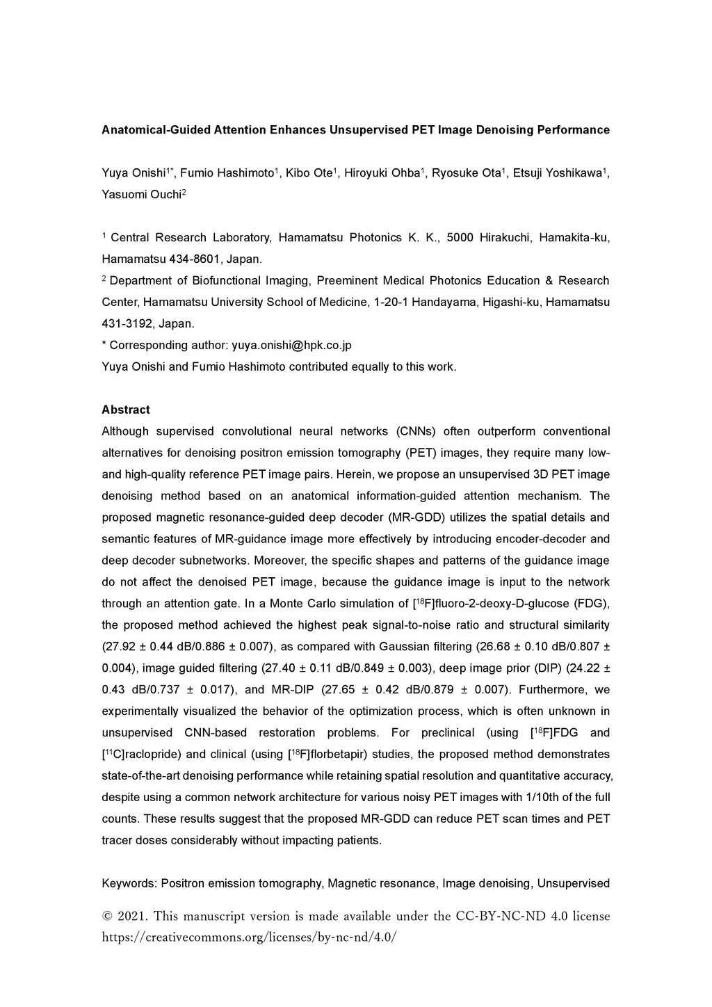Although supervised convolutional neural networks (CNNs) often outperform conventional alternatives for denoising positron emission tomography (PET) images, they require many low- and high-quality reference PET image pairs. Herein, we propose an unsupervised 3D PET image denoising method based on an anatomical information-guided attention mechanism. The proposed magnetic resonance-guided deep decoder (MR-GDD) utilizes the spatial details and semantic features of MR-guidance image more effectively by introducing encoder-decoder and deep decoder subnetworks. Moreover, the specific shapes and patterns of the guidance image do not affect the denoised PET image, because the guidance image is input to the network through an attention gate. In a Monte Carlo simulation of [F]fluoro-2-deoxy-D-glucose (FDG), the proposed method achieved the highest peak signal-to-noise ratio and structural similarity (27.92 0.44 dB/0.886 0.007), as compared with Gaussian filtering (26.68 0.10 dB/0.807 0.004), image guided filtering (27.40 0.11 dB/0.849 0.003), deep image prior (DIP) (24.22 0.43 dB/0.737 0.017), and MR-DIP (27.65 0.42 dB/0.879 0.007). Furthermore, we experimentally visualized the behavior of the optimization process, which is often unknown in unsupervised CNN-based restoration problems. For preclinical (using [F]FDG and [C]raclopride) and clinical (using [F]florbetapir) studies, the proposed method demonstrates state-of-the-art denoising performance while retaining spatial resolution and quantitative accuracy, despite using a common network architecture for various noisy PET images with 1/10th of the full counts. These results suggest that the proposed MR-GDD can reduce PET scan times and PET tracer doses considerably without impacting patients.