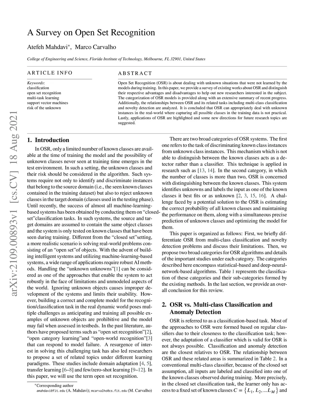 Open Set Recognition (OSR) is about dealing with unknown situations that were not learned by the models during training. In this paper, we provide a survey of existing works about OSR and distinguish their respective advantages and disadvantages to help out new researchers interested in the subject. The categorization of OSR models is provided along with an extensive summary of recent progress. Additionally, the relationships between OSR and its related tasks including multi-class classification and novelty detection are analyzed. It is concluded that OSR can appropriately deal with unknown instances in the real-world where capturing all possible classes in the training data is not practical. Lastly, applications of OSR are highlighted and some new directions for future research topics are suggested.