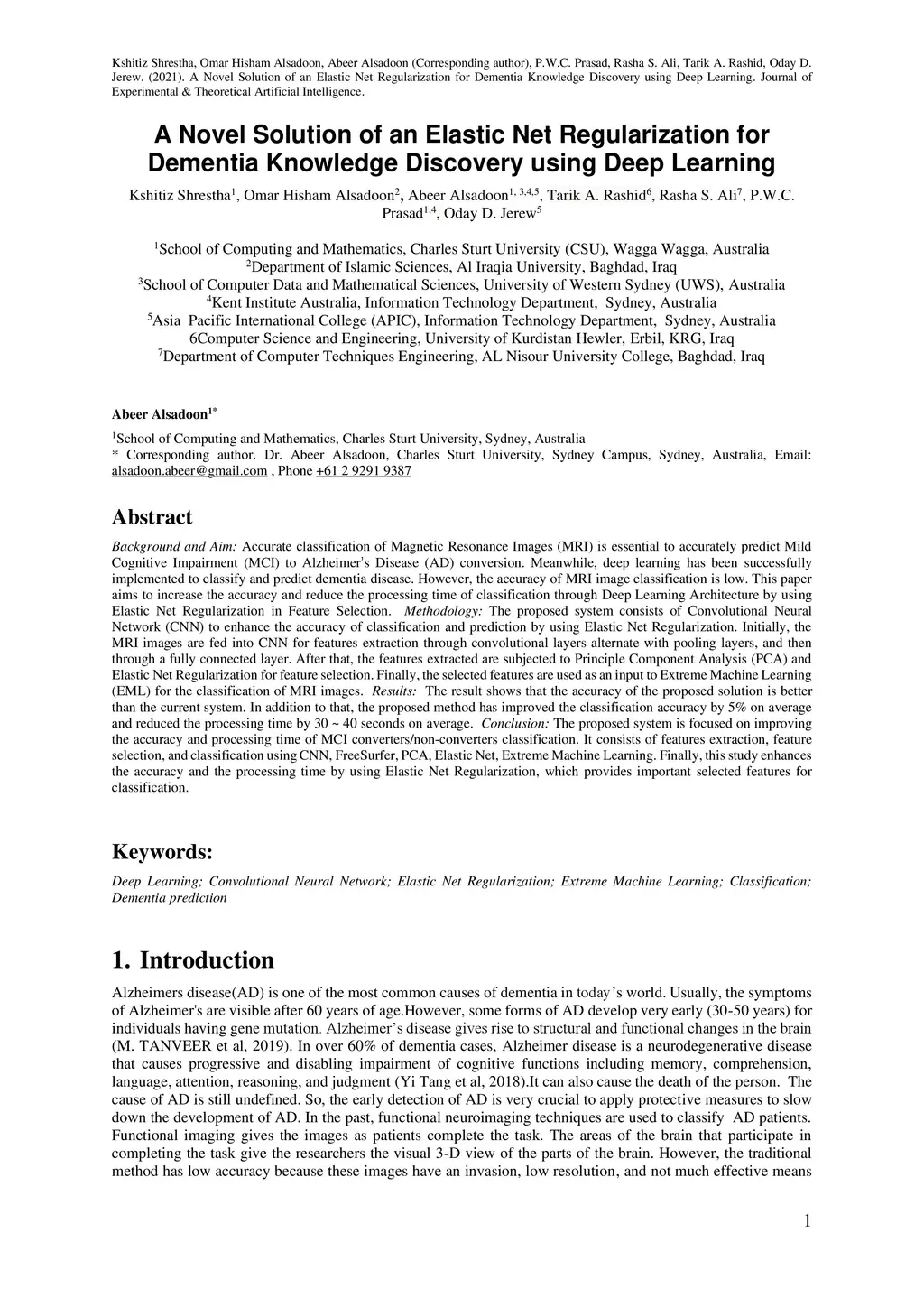Background and Aim: Accurate classification of Magnetic Resonance Images (MRI) is essential to accurately predict Mild Cognitive Impairment (MCI) to Alzheimer's Disease (AD) conversion. Meanwhile, deep learning has been successfully implemented to classify and predict dementia disease. However, the accuracy of MRI image classification is low. This paper aims to increase the accuracy and reduce the processing time of classification through Deep Learning Architecture by using Elastic Net Regularization in Feature Selection. Methodology: The proposed system consists of Convolutional Neural Network (CNN) to enhance the accuracy of classification and prediction by using Elastic Net Regularization. Initially, the MRI images are fed into CNN for features extraction through convolutional layers alternate with pooling layers, and then through a fully connected layer. After that, the features extracted are subjected to Principle Component Analysis (PCA) and Elastic Net Regularization for feature selection. Finally, the selected features are used as an input to Extreme Machine Learning (EML) for the classification of MRI images. Results: The result shows that the accuracy of the proposed solution is better than the current system. In addition to that, the proposed method has improved the classification accuracy by 5% on average and reduced the processing time by 30 ~ 40 seconds on average. Conclusion: The proposed system is focused on improving the accuracy and processing time of MCI converters/non-converters classification. It consists of features extraction, feature selection, and classification using CNN, FreeSurfer, PCA, Elastic Net, Extreme Machine Learning. Finally, this study enhances the accuracy and the processing time by using Elastic Net Regularization, which provides important selected features for classification.