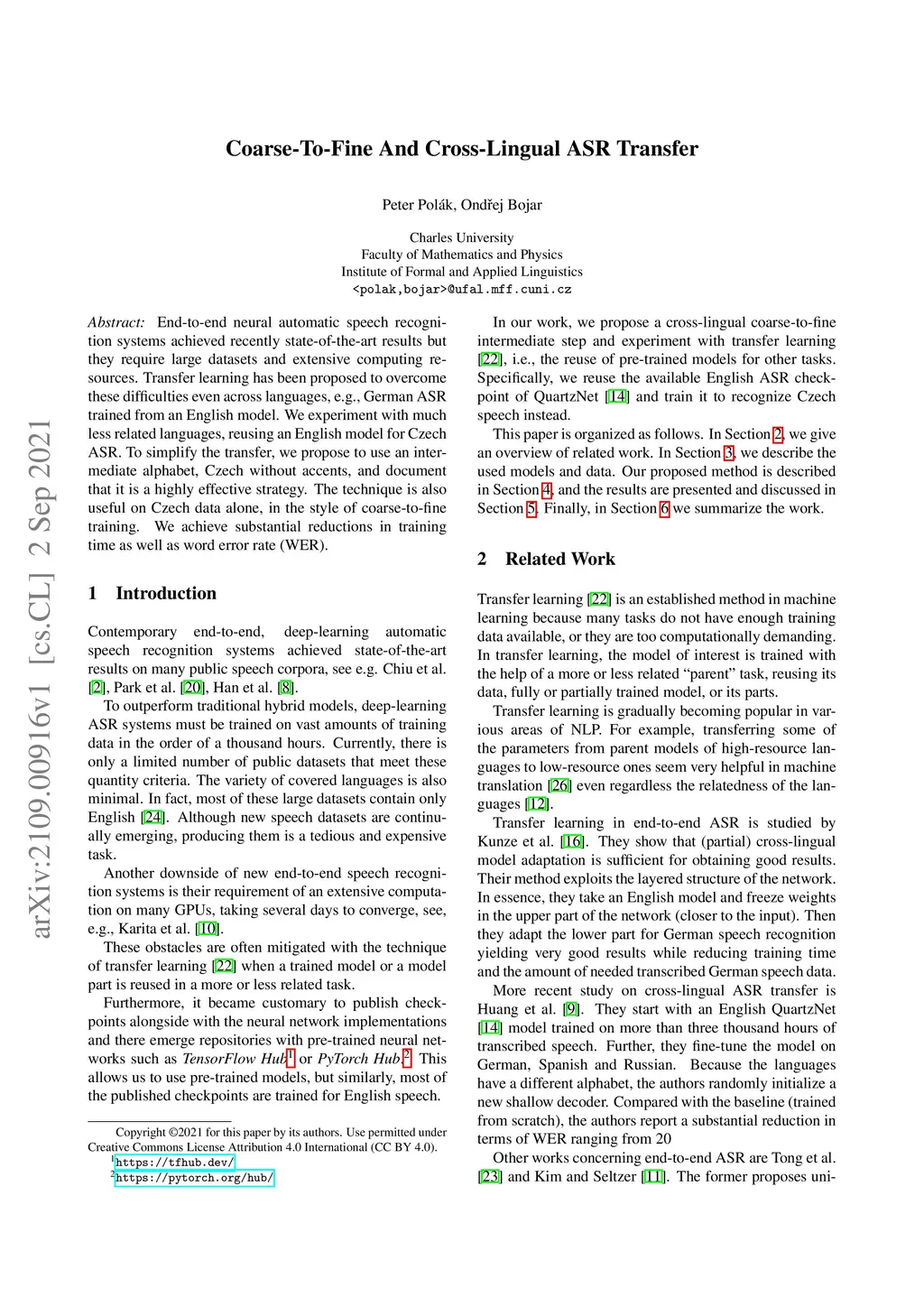 End-to-end neural automatic speech recognition systems achieved recently state-of-the-art results, but they require large datasets and extensive computing resources. Transfer learning has been proposed to overcome these difficulties even across languages, e.g., German ASR trained from an English model. We experiment with much less related languages, reusing an English model for Czech ASR. To simplify the transfer, we propose to use an intermediate alphabet, Czech without accents, and document that it is a highly effective strategy. The technique is also useful on Czech data alone, in the style of coarse-to-fine training. We achieve substantial eductions in training time as well as word error rate (WER).