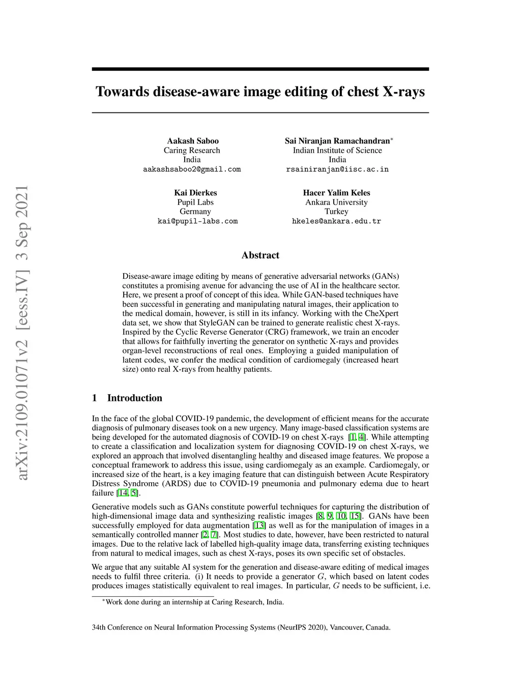 Disease-aware image editing by means of generative adversarial networks (GANs) constitutes a promising avenue for advancing the use of AI in the healthcare sector. Here, we present a proof of concept of this idea. While GAN-based techniques have been successful in generating and manipulating natural images, their application to the medical domain, however, is still in its infancy. Working with the CheXpert data set, we show that StyleGAN can be trained to generate realistic chest X-rays. Inspired by the Cyclic Reverse Generator (CRG) framework, we train an encoder that allows for faithfully inverting the generator on synthetic X-rays and provides organ-level reconstructions of real ones. Employing a guided manipulation of latent codes, we confer the medical condition of cardiomegaly (increased heart size) onto real X-rays from healthy patients. This work was presented in the Medical Imaging meets Neurips Workshop 2020, which was held as part of the 34th Conference on Neural Information Processing Systems (NeurIPS 2020) in Vancouver, Canada