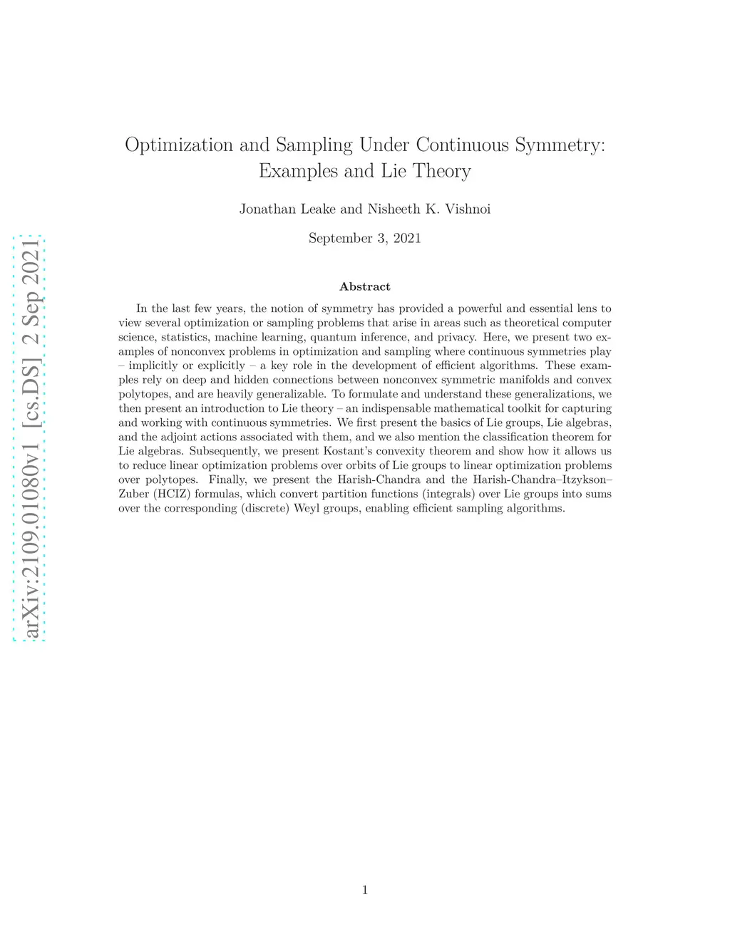 Optimization and Sampling Under Continuous Symmetry: Examples and Lie