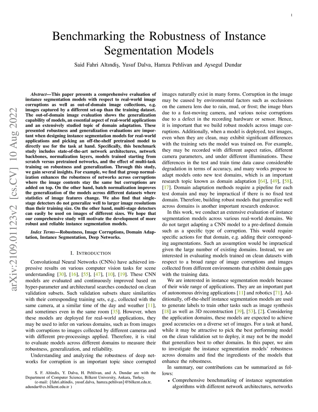 This paper presents a comprehensive evaluation of instance segmentation models with respect to real-world image corruptions as well as out-of-domain image collections, e.g. images captured by a different set-up than the training dataset. The out-of-domain image evaluation shows the generalization capability of models, an essential aspect of real-world applications and an extensively studied topic of domain adaptation. These presented robustness and generalization evaluations are important when designing instance segmentation models for real-world applications and picking an off-the-shelf pretrained model to directly use for the task at hand. Specifically, this benchmark study includes state-of-the-art network architectures, network backbones, normalization layers, models trained starting from scratch versus pretrained networks, and the effect of multi-task training on robustness and generalization. Through this study, we gain several insights. For example, we find that group normalization enhances the robustness of networks across corruptions where the image contents stay the same but corruptions are added on top. On the other hand, batch normalization improves the generalization of the models across different datasets where statistics of image features change. We also find that single-stage detectors do not generalize well to larger image resolutions than their training size. On the other hand, multi-stage detectors can easily be used on images of different sizes. We hope that our comprehensive study will motivate the development of more robust and reliable instance segmentation models.