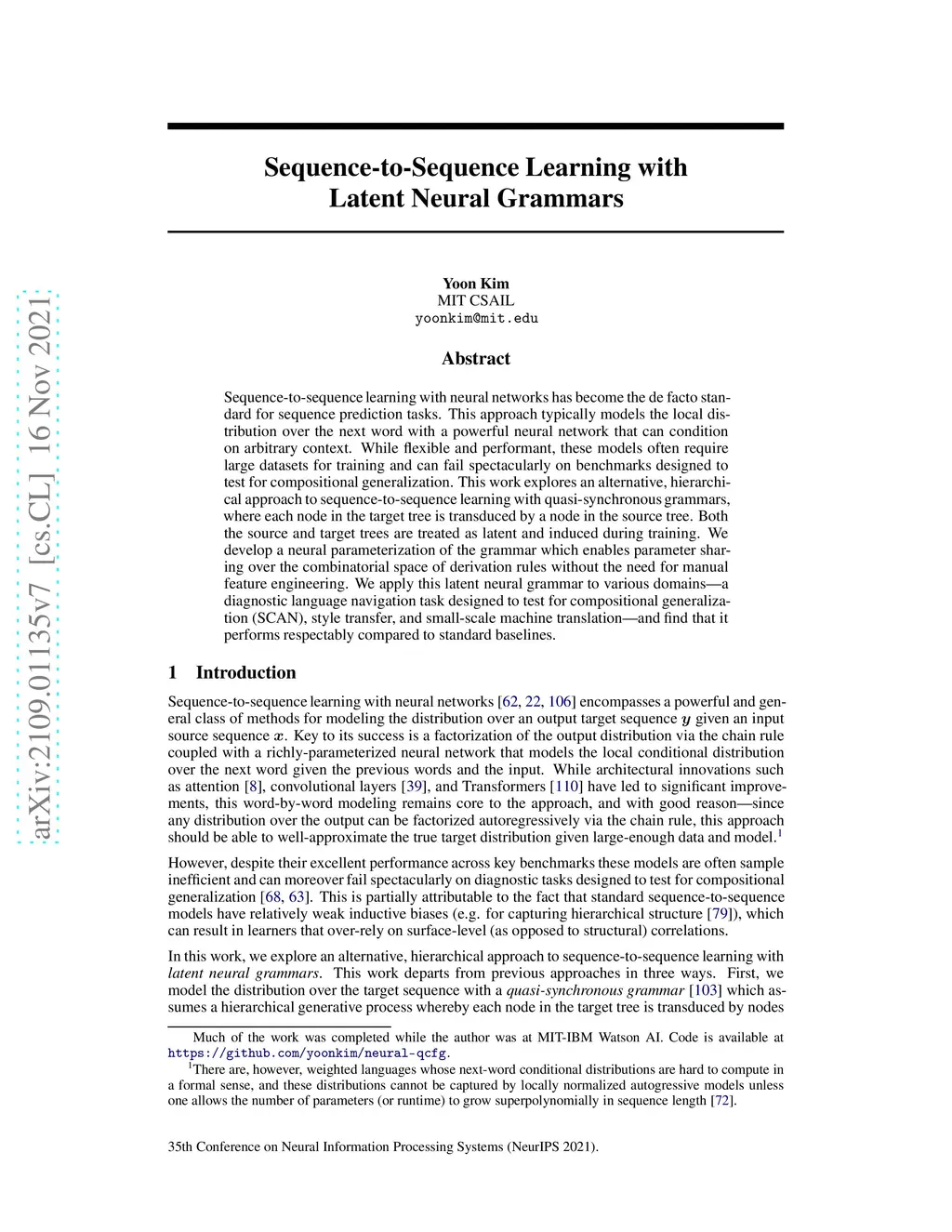 Sequence-to-sequence learning with neural networks has become the de facto standard for sequence prediction tasks. This approach typically models the local distribution over the next word with a powerful neural network that can condition on arbitrary context. While flexible and performant, these models often require large datasets for training and can fail spectacularly on benchmarks designed to test for compositional generalization. This work explores an alternative, hierarchical approach to sequence-to-sequence learning with quasi-synchronous grammars, where each node in the target tree is transduced by a node in the source tree. Both the source and target trees are treated as latent and induced during training. We develop a neural parameterization of the grammar which enables parameter sharing over the combinatorial space of derivation rules without the need for manual feature engineering. We apply this latent neural grammar to various domains -- a diagnostic language navigation task designed to test for compositional generalization (SCAN), style transfer, and small-scale machine translation -- and find that it performs respectably compared to standard baselines.