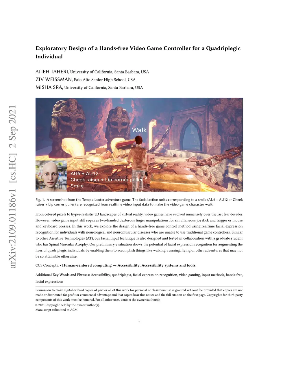 From colored pixels to hyper-realistic 3D landscapes of virtual reality, video games have evolved immensely over the last few decades. However, video game input still requires two-handed dexterous finger manipulations for simultaneous joystick and trigger or mouse and keyboard presses. In this work, we explore the design of a hands-free game control method using realtime facial expression recognition for individuals with neurological and neuromuscular diseases who are unable to use traditional game controllers. Similar to other Assistive Technologies (AT), our facial input technique is also designed and tested in collaboration with a graduate student who has Spinal Muscular Atrophy. Our preliminary evaluation shows the potential of facial expression recognition for augmenting the lives of quadriplegic individuals by enabling them to accomplish things like walking, running, flying or other adventures that may not be so attainable otherwise.