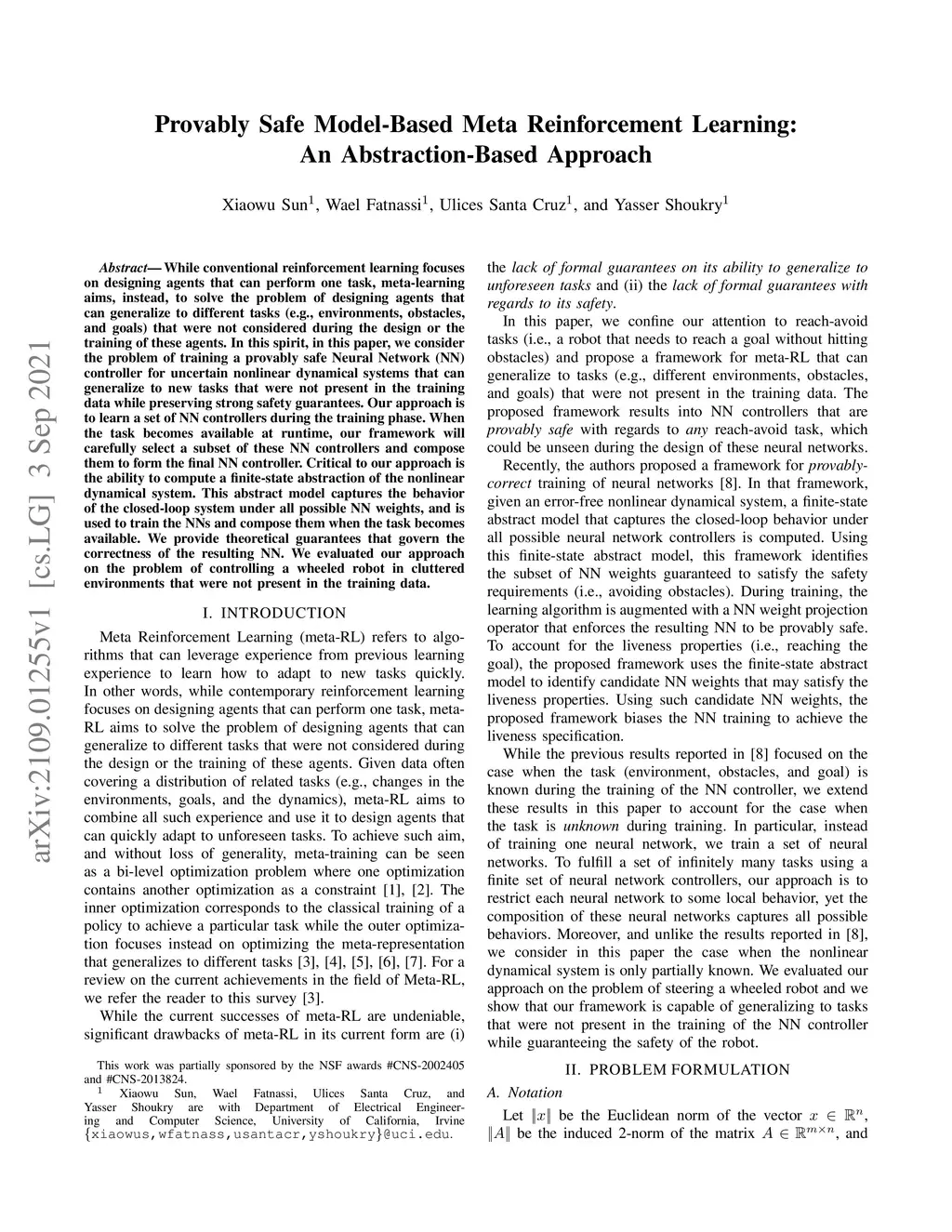 While conventional reinforcement learning focuses on designing agents that can perform one task, meta-learning aims, instead, to solve the problem of designing agents that can generalize to different tasks (e.g., environments, obstacles, and goals) that were not considered during the design or the training of these agents. In this spirit, in this paper, we consider the problem of training a provably safe Neural Network (NN) controller for uncertain nonlinear dynamical systems that can generalize to new tasks that were not present in the training data while preserving strong safety guarantees. Our approach is to learn a set of NN controllers during the training phase. When the task becomes available at runtime, our framework will carefully select a subset of these NN controllers and compose them to form the final NN controller. Critical to our approach is the ability to compute a finite-state abstraction of the nonlinear dynamical system. This abstract model captures the behavior of the closed-loop system under all possible NN weights, and is used to train the NNs and compose them when the task becomes available. We provide theoretical guarantees that govern the correctness of the resulting NN. We evaluated our approach on the problem of controlling a wheeled robot in cluttered environments that were not present in the training data.
