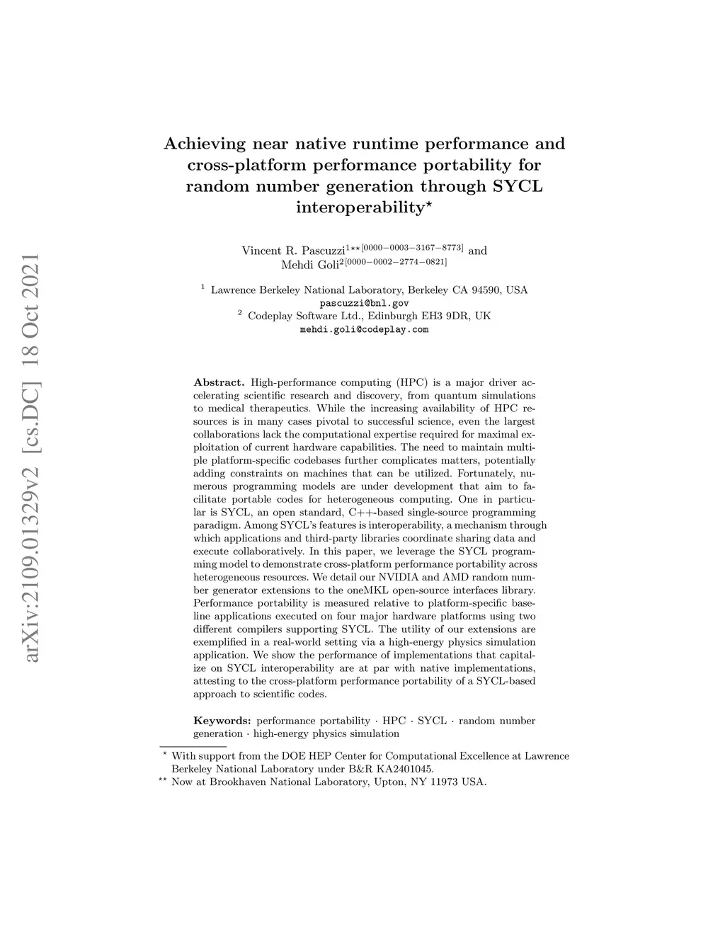 High-performance computing (HPC) is a major driver accelerating scientific research and discovery, from quantum simulations to medical therapeutics. While the increasing availability of HPC resources is in many cases pivotal to successful science, even the largest collaborations lack the computational expertise required for maximal exploitation of current hardware capabilities. The need to maintain multiple platform-specific codebases further complicates matters, potentially adding constraints on machines that can be utilized. Fortunately, numerous programming models are under development that aim to facilitate portable codes for heterogeneous computing. One in particular is SYCL, an open standard, C++-based single-source programming paradigm. Among SYCL's features is interoperability, a mechanism through which applications and third-party libraries coordinate sharing data and execute collaboratively. In this paper, we leverage the SYCL programming model to demonstrate cross-platform performance portability across heterogeneous resources. We detail our NVIDIA and AMD random number generator extensions to the oneMKL open-source interfaces library. Performance portability is measured relative to platform-specific baseline applications executed on four major hardware platforms using two different compilers supporting SYCL. The utility of our extensions are exemplified in a real-world setting via a high-energy physics simulation application. We show the performance of implementations that capitalize on SYCL interoperability are at par with native implementations, attesting to the cross-platform performance portability of a SYCL-based approach to scientific codes.
