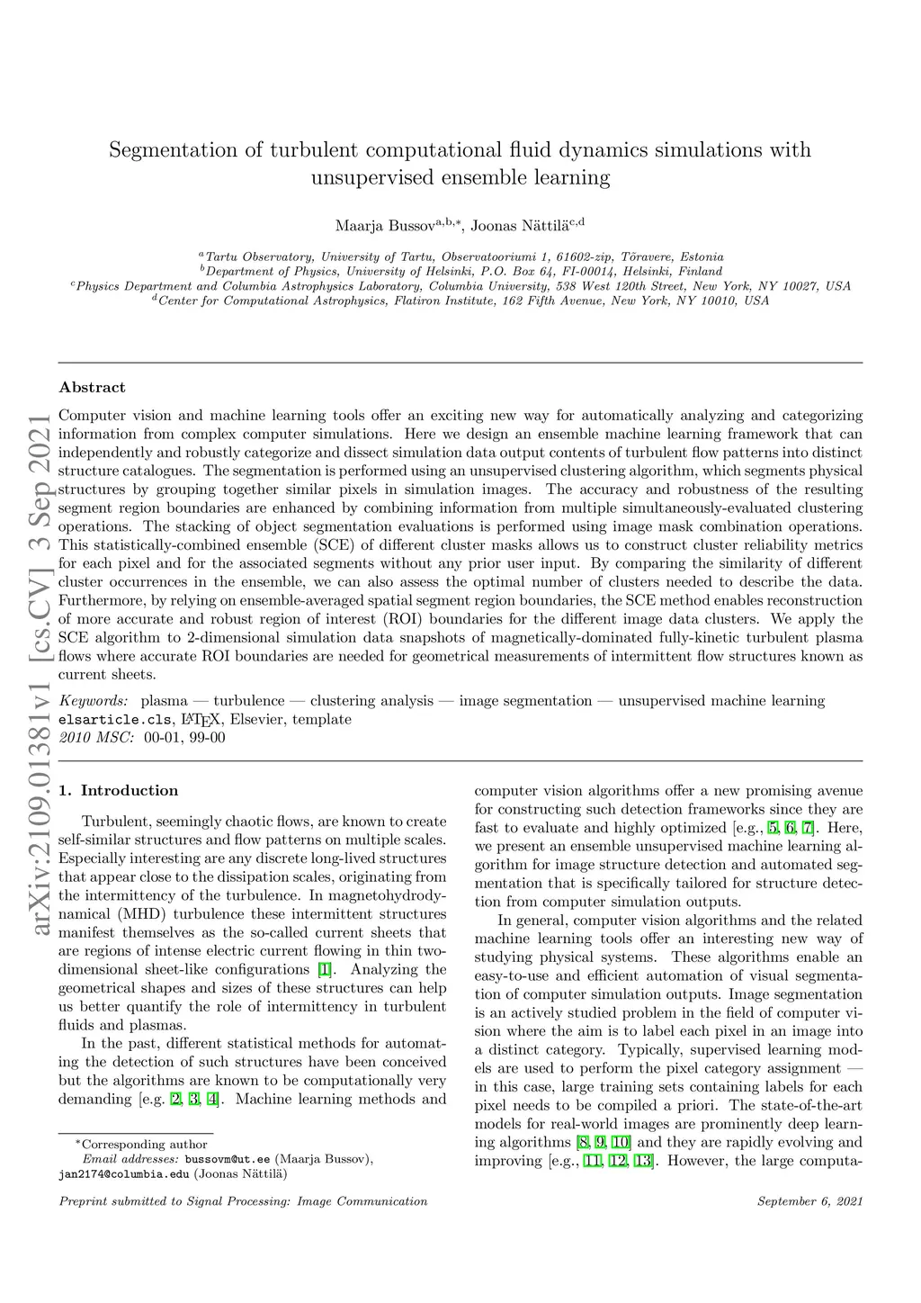 Computer vision and machine learning tools offer an exciting new way for automatically analyzing and categorizing information from complex computer simulations. Here we design an ensemble machine learning framework that can independently and robustly categorize and dissect simulation data output contents of turbulent flow patterns into distinct structure catalogues. The segmentation is performed using an unsupervised clustering algorithm, which segments physical structures by grouping together similar pixels in simulation images. The accuracy and robustness of the resulting segment region boundaries are enhanced by combining information from multiple simultaneously-evaluated clustering operations. The stacking of object segmentation evaluations is performed using image mask combination operations. This statistically-combined ensemble (SCE) of different cluster masks allows us to construct cluster reliability metrics for each pixel and for the associated segments without any prior user input. By comparing the similarity of different cluster occurrences in the ensemble, we can also assess the optimal number of clusters needed to describe the data. Furthermore, by relying on ensemble-averaged spatial segment region boundaries, the SCE method enables reconstruction of more accurate and robust region of interest (ROI) boundaries for the different image data clusters. We apply the SCE algorithm to 2-dimensional simulation data snapshots of magnetically-dominated fully-kinetic turbulent plasma flows where accurate ROI boundaries are needed for geometrical measurements of intermittent flow structures known as current sheets.