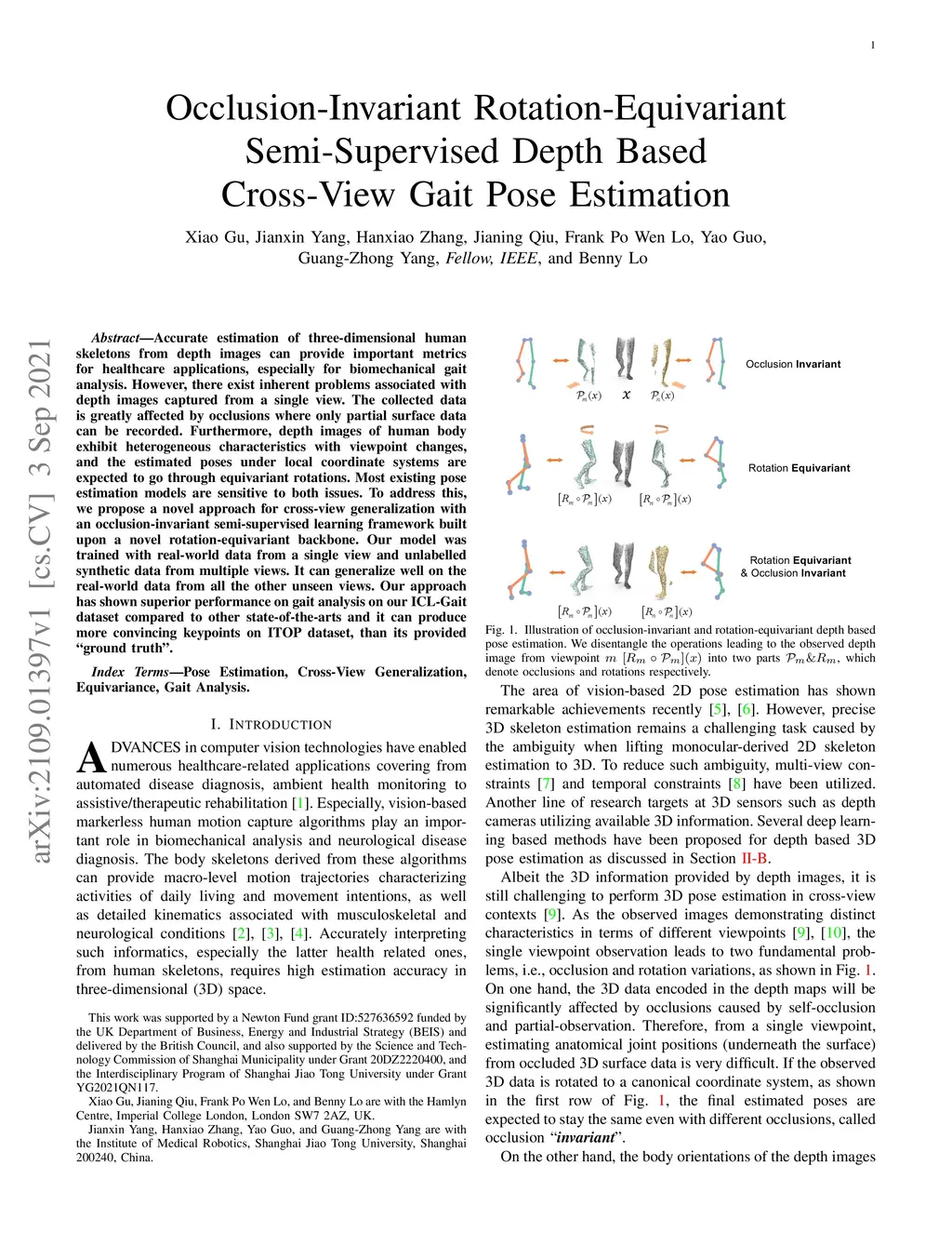 Accurate estimation of three-dimensional human skeletons from depth images can provide important metrics for healthcare applications, especially for biomechanical gait analysis. However, there exist inherent problems associated with depth images captured from a single view. The collected data is greatly affected by occlusions where only partial surface data can be recorded. Furthermore, depth images of human body exhibit heterogeneous characteristics with viewpoint changes, and the estimated poses under local coordinate systems are expected to go through equivariant rotations. Most existing pose estimation models are sensitive to both issues. To address this, we propose a novel approach for cross-view generalization with an occlusion-invariant semi-supervised learning framework built upon a novel rotation-equivariant backbone. Our model was trained with real-world data from a single view and unlabelled synthetic data from multiple views. It can generalize well on the real-world data from all the other unseen views. Our approach has shown superior performance on gait analysis on our ICL-Gait dataset compared to other state-of-the-arts and it can produce more convincing keypoints on ITOP dataset, than its provided "ground truth".