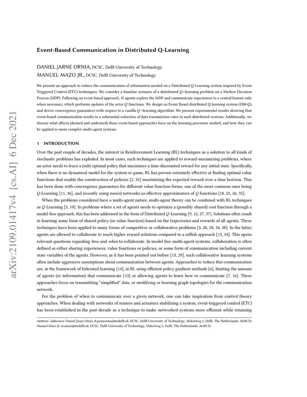 Event-Based Communication in Distributed Q-Learning