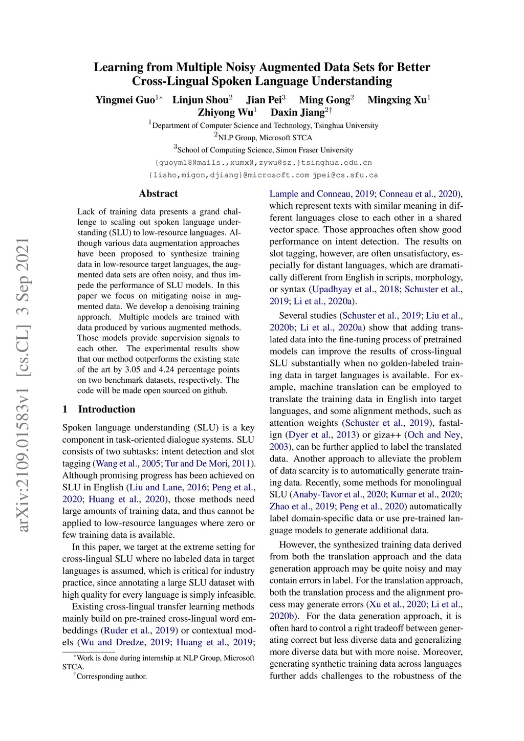 Lack of training data presents a grand challenge to scaling out spoken language understanding (SLU) to low-resource languages. Although various data augmentation approaches have been proposed to synthesize training data in low-resource target languages, the augmented data sets are often noisy, and thus impede the performance of SLU models. In this paper we focus on mitigating noise in augmented data. We develop a denoising training approach. Multiple models are trained with data produced by various augmented methods. Those models provide supervision signals to each other. The experimental results show that our method outperforms the existing state of the art by 3.05 and 4.24 percentage points on two benchmark datasets, respectively. The code will be made open sourced on github.