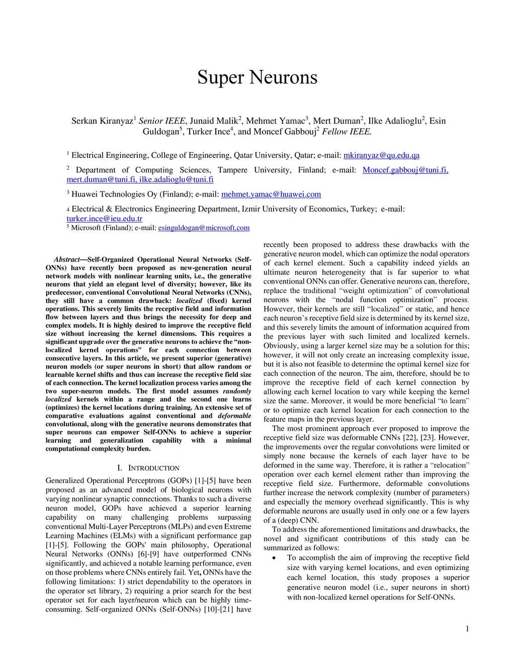 Self-Organized Operational Neural Networks (Self-ONNs) have recently been proposed as new-generation neural network models with nonlinear learning units, i.e., the generative neurons that yield an elegant level of diversity; however, like its predecessor, conventional Convolutional Neural Networks (CNNs), they still have a common drawback: localized (fixed) kernel operations. This severely limits the receptive field and information flow between layers and thus brings the necessity for deep and complex models. It is highly desired to improve the receptive field size without increasing the kernel dimensions. This requires a significant upgrade over the generative neurons to achieve the non-localized kernel operations for each connection between consecutive layers. In this article, we present superior (generative) neuron models (or super neurons in short) that allow random or learnable kernel shifts and thus can increase the receptive field size of each connection. The kernel localization process varies among the two super-neuron models. The first model assumes randomly localized kernels within a range and the second one learns (optimizes) the kernel locations during training. An extensive set of comparative evaluations against conventional and deformable convolutional, along with the generative neurons demonstrates that super neurons can empower Self-ONNs to achieve a superior learning and generalization capability with a minimal computational complexity burden.