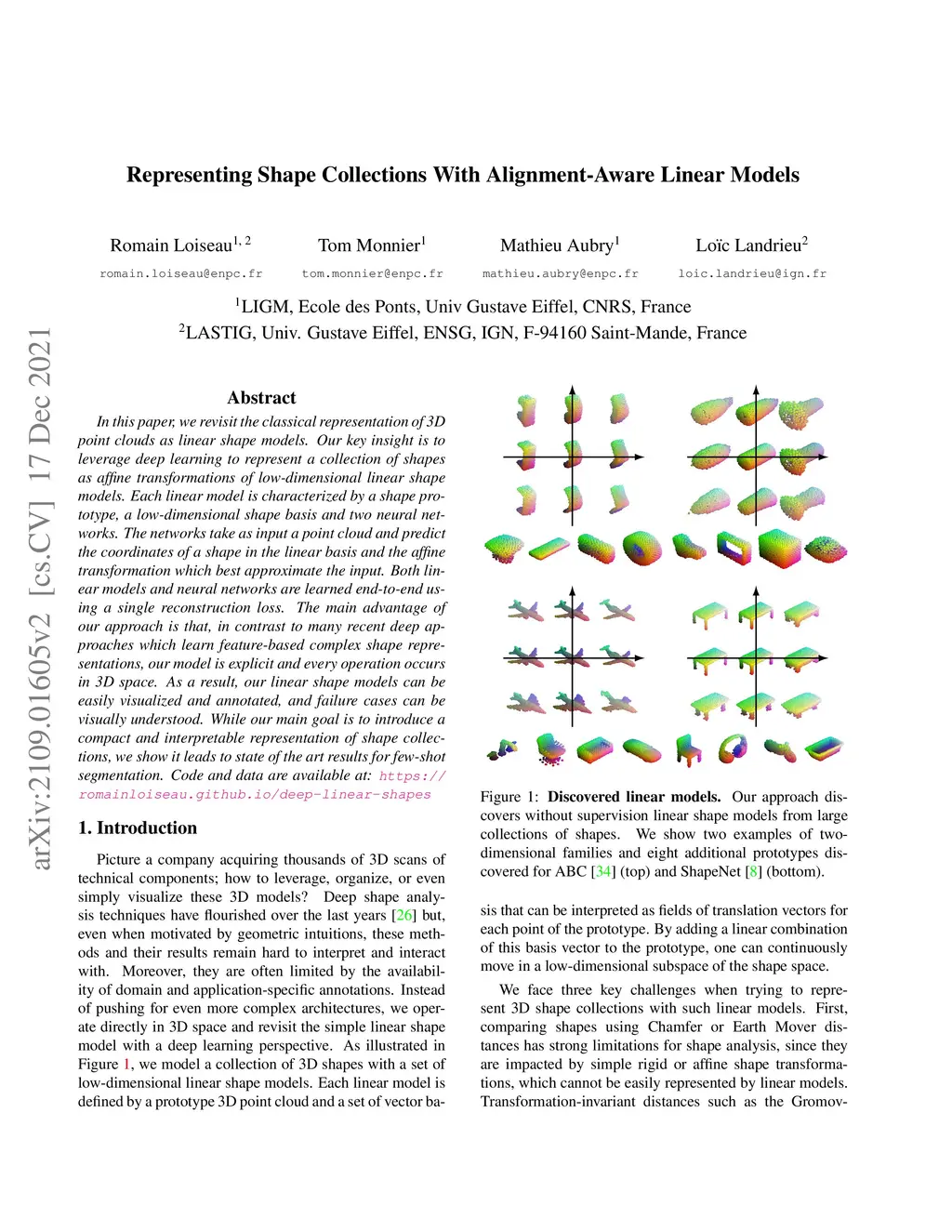 In this paper, we revisit the classical representation of 3D point clouds as linear shape models. Our key insight is to leverage deep learning to represent a collection of shapes as affine transformations of low-dimensional linear shape models. Each linear model is characterized by a shape prototype, a low-dimensional shape basis and two neural networks. The networks take as input a point cloud and predict the coordinates of a shape in the linear basis and the affine transformation which best approximate the input. Both linear models and neural networks are learned end-to-end using a single reconstruction loss. The main advantage of our approach is that, in contrast to many recent deep approaches which learn feature-based complex shape representations, our model is explicit and every operation occurs in 3D space. As a result, our linear shape models can be easily visualized and annotated, and failure cases can be visually understood. While our main goal is to introduce a compact and interpretable representation of shape collections, we show it leads to state of the art results for few-shot segmentation.