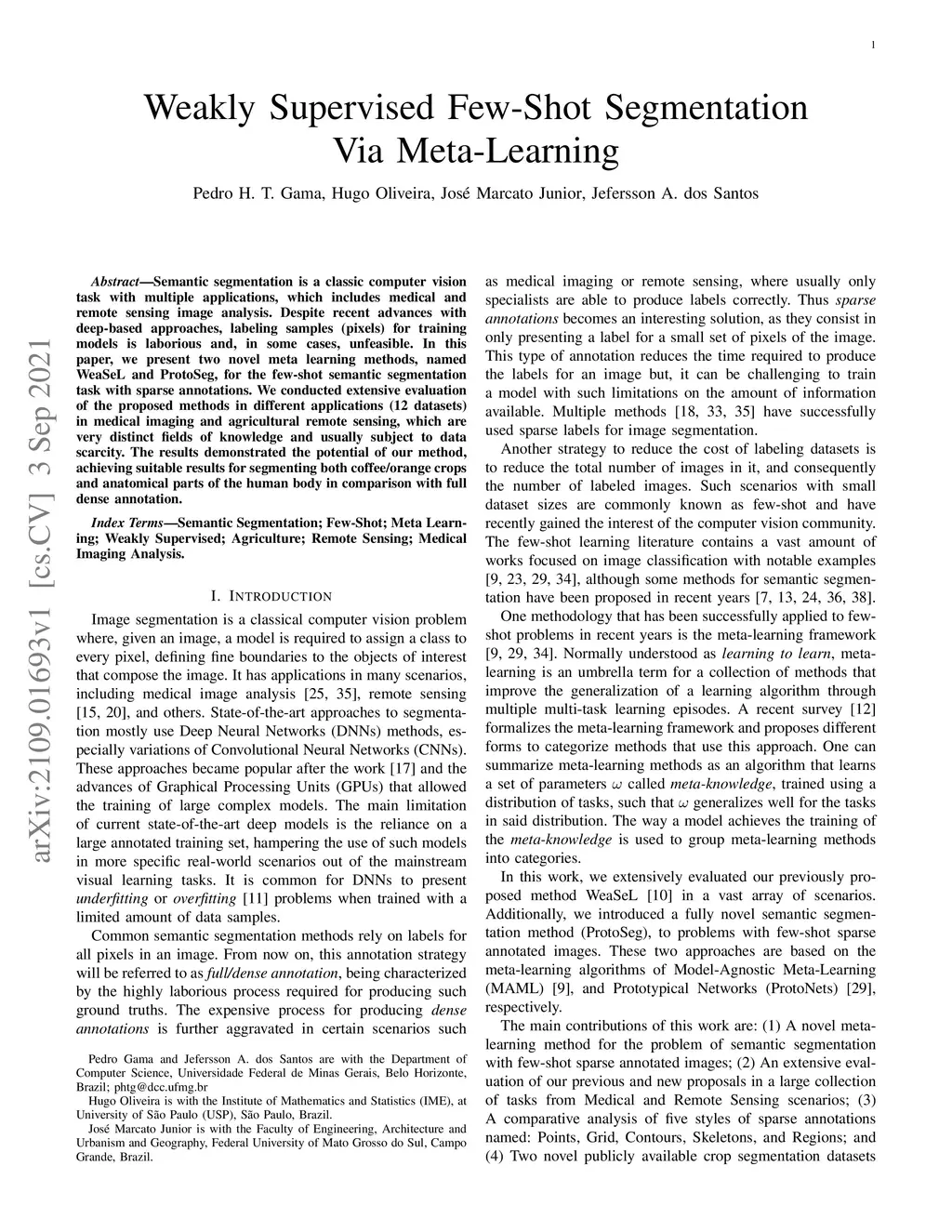 Semantic segmentation is a classic computer vision task with multiple applications, which includes medical and remote sensing image analysis. Despite recent advances with deep-based approaches, labeling samples (pixels) for training models is laborious and, in some cases, unfeasible. In this paper, we present two novel meta learning methods, named WeaSeL and ProtoSeg, for the few-shot semantic segmentation task with sparse annotations. We conducted extensive evaluation of the proposed methods in different applications (12 datasets) in medical imaging and agricultural remote sensing, which are very distinct fields of knowledge and usually subject to data scarcity. The results demonstrated the potential of our method, achieving suitable results for segmenting both coffee/orange crops and anatomical parts of the human body in comparison with full dense annotation.