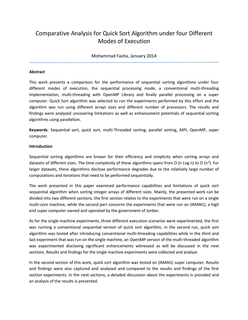 This work presents a comparison for the performance of sequential sorting algorithms under four different modes of execution, the sequential processing mode, a conventional multi-threading implementation, multi-threading with OpenMP Library and finally parallel processing on a super computer. Quick Sort algorithm was selected to run the experiments performed by this effort and the algorithm was run using different arrays sizes and different number of processors. The results and findings were analyzed uncovering limitations as well as enhancement potentials of sequential sorting algorithms using parallelism.