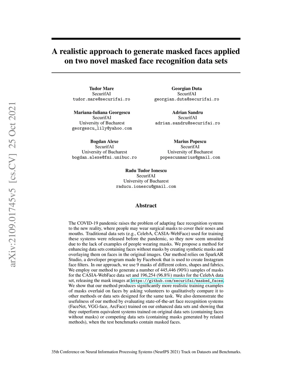 The COVID-19 pandemic raises the problem of adapting face recognition systems to the new reality, where people may wear surgical masks to cover their noses and mouths. Traditional data sets (e.g., CelebA, CASIA-WebFace) used for training these systems were released before the pandemic, so they now seem unsuited due to the lack of examples of people wearing masks. We propose a method for enhancing data sets containing faces without masks by creating synthetic masks and overlaying them on faces in the original images. Our method relies on SparkAR Studio, a developer program made by Facebook that is used to create Instagram face filters. In our approach, we use 9 masks of different colors, shapes and fabrics. We employ our method to generate a number of 445,446 (90%) samples of masks for the CASIA-WebFace data set and 196,254 (96.8%) masks for the CelebA data set, releasing the mask images at https://github.com/securifai/masked_faces. We show that our method produces significantly more realistic training examples of masks overlaid on faces by asking volunteers to qualitatively compare it to other methods or data sets designed for the same task. We also demonstrate the usefulness of our method by evaluating state-of-the-art face recognition systems (FaceNet, VGG-face, ArcFace) trained on our enhanced data sets and showing that they outperform equivalent systems trained on original data sets (containing faces without masks) or competing data sets (containing masks generated by related methods), when the test benchmarks contain masked faces.