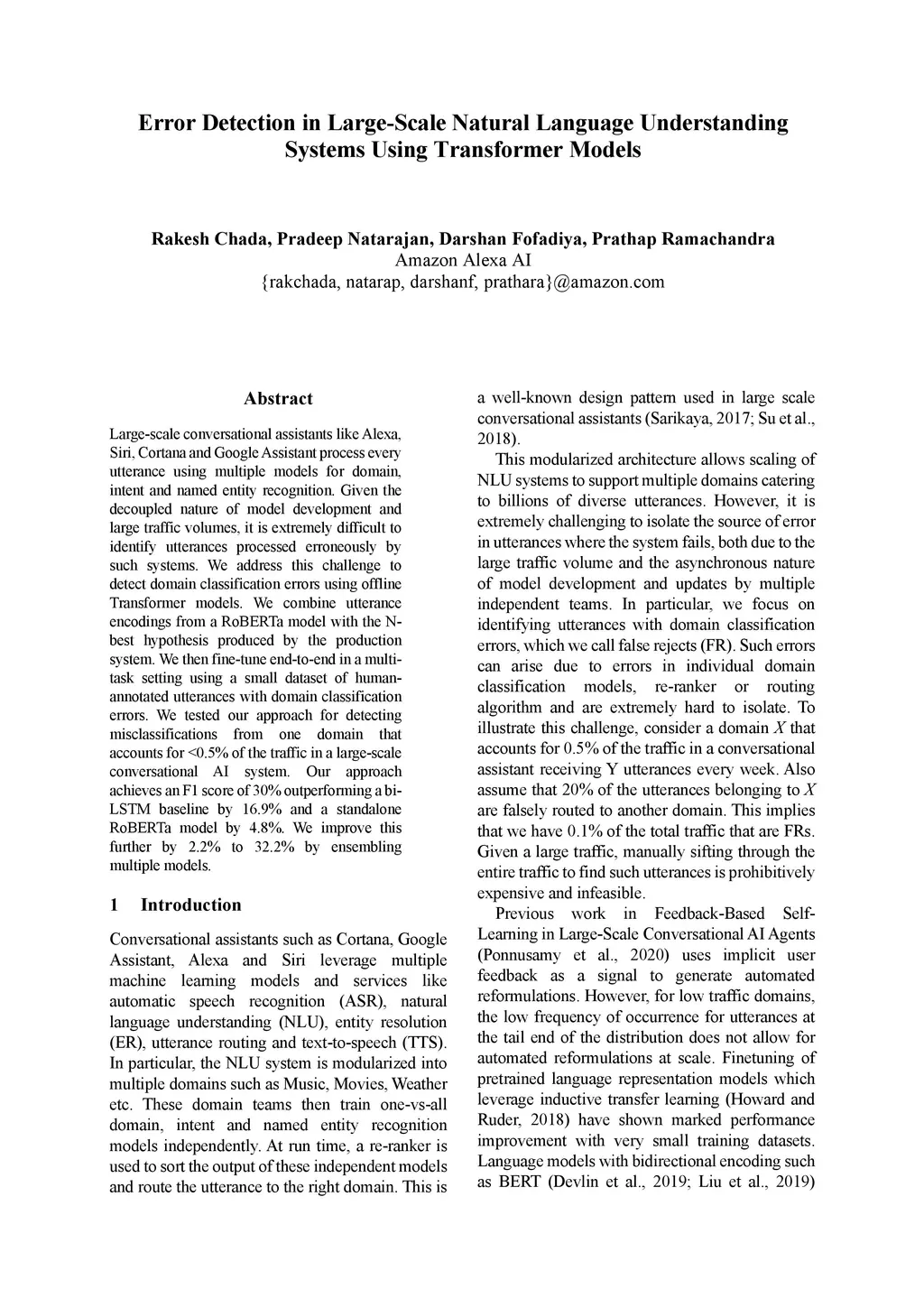 Large-scale conversational assistants like Alexa, Siri, Cortana and Google Assistant process every utterance using multiple models for domain, intent and named entity recognition. Given the decoupled nature of model development and large traffic volumes, it is extremely difficult to identify utterances processed erroneously by such systems. We address this challenge to detect domain classification errors using offline Transformer models. We combine utterance encodings from a RoBERTa model with the Nbest hypothesis produced by the production system. We then fine-tune end-to-end in a multitask setting using a small dataset of humanannotated utterances with domain classification errors. We tested our approach for detecting misclassifications from one domain that accounts for <0.5% of the traffic in a large-scale conversational AI system. Our approach achieves an F1 score of 30% outperforming a bi- LSTM baseline by 16.9% and a standalone RoBERTa model by 4.8%. We improve this further by 2.2% to 32.2% by ensembling multiple models.